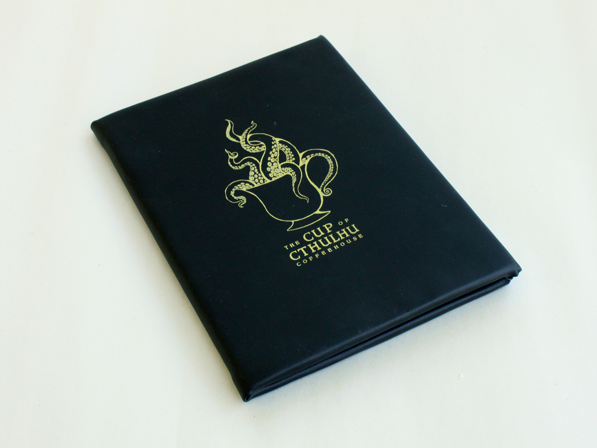 The menu and its interior illustrations are inspired by the Necronomicon, the fictional grimoire, and the creepy creatures found in Lovecraft's novels.