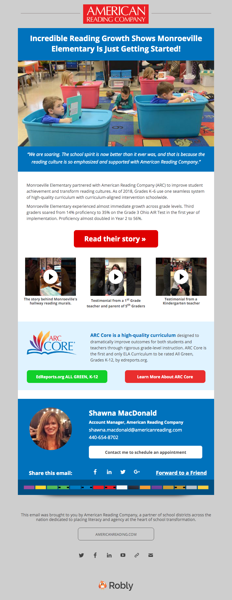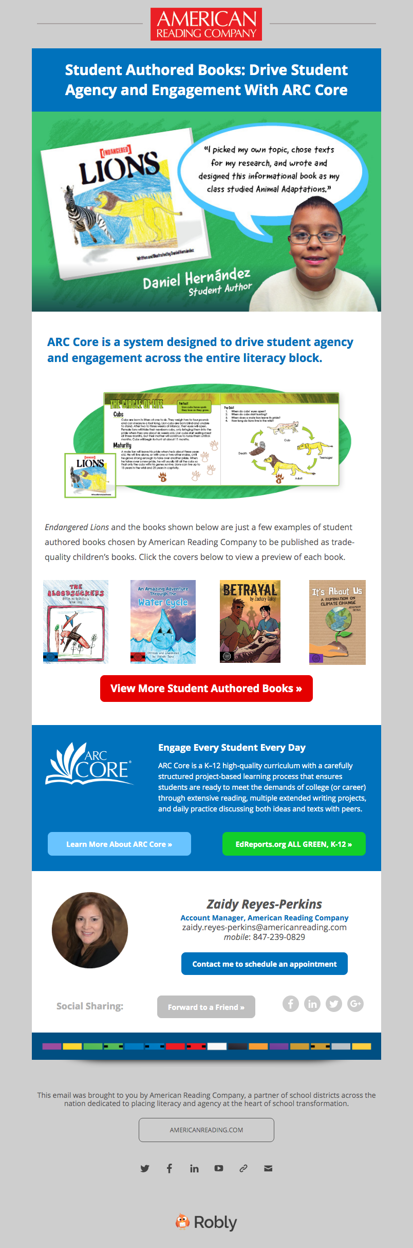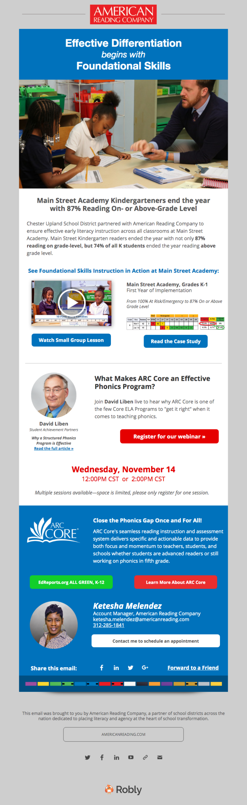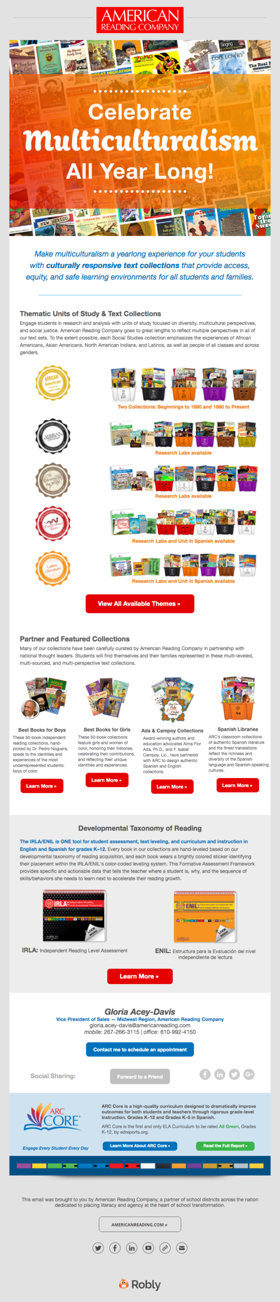 ARC's Midwest audience and even state-specific schools all have different needs. Many Midwest schools supported dual-language learning so both English and Spanish language arts were a key selling point. Our email campaigns would target specific school board members, principals, and teachers with information about curated classroom libraries that encouraged multiculturalism and ARC Core's robust project-based K-12 curriculum. Other campaigns were used for events, webinars, and other learning opportunities with phonics experts and coaches.