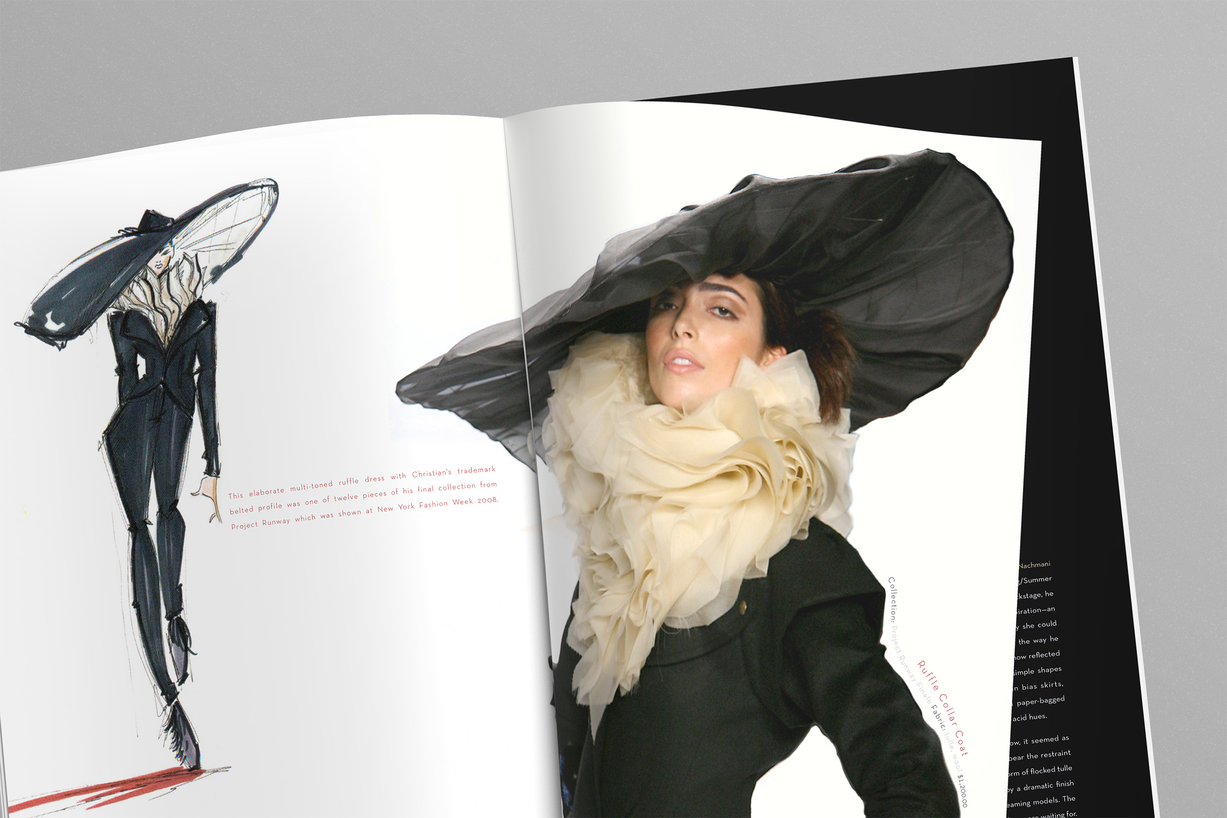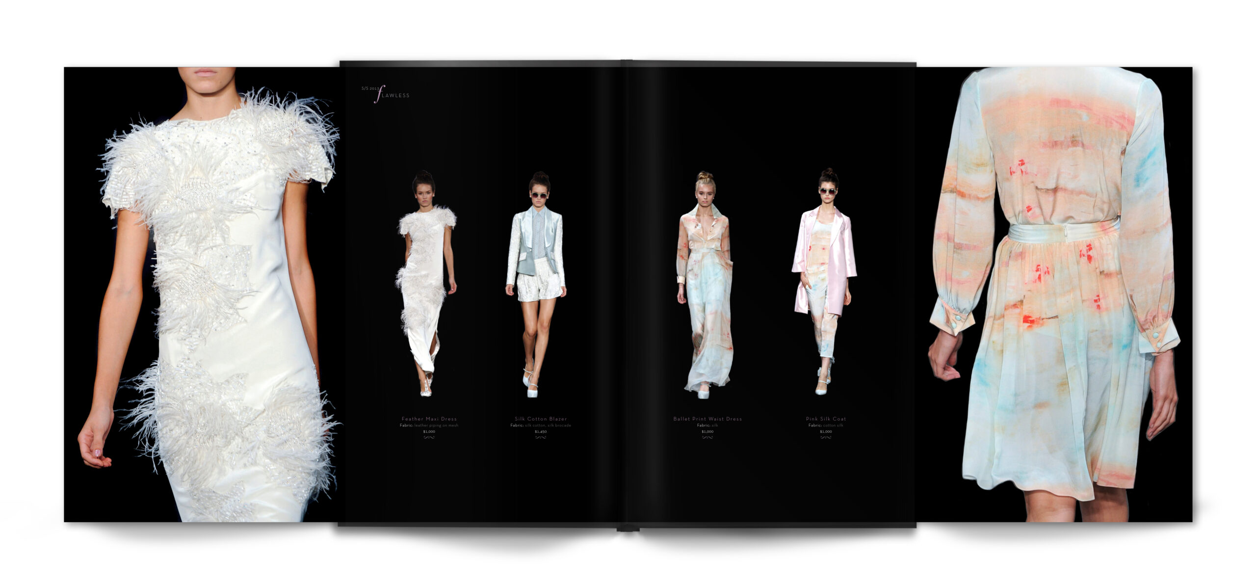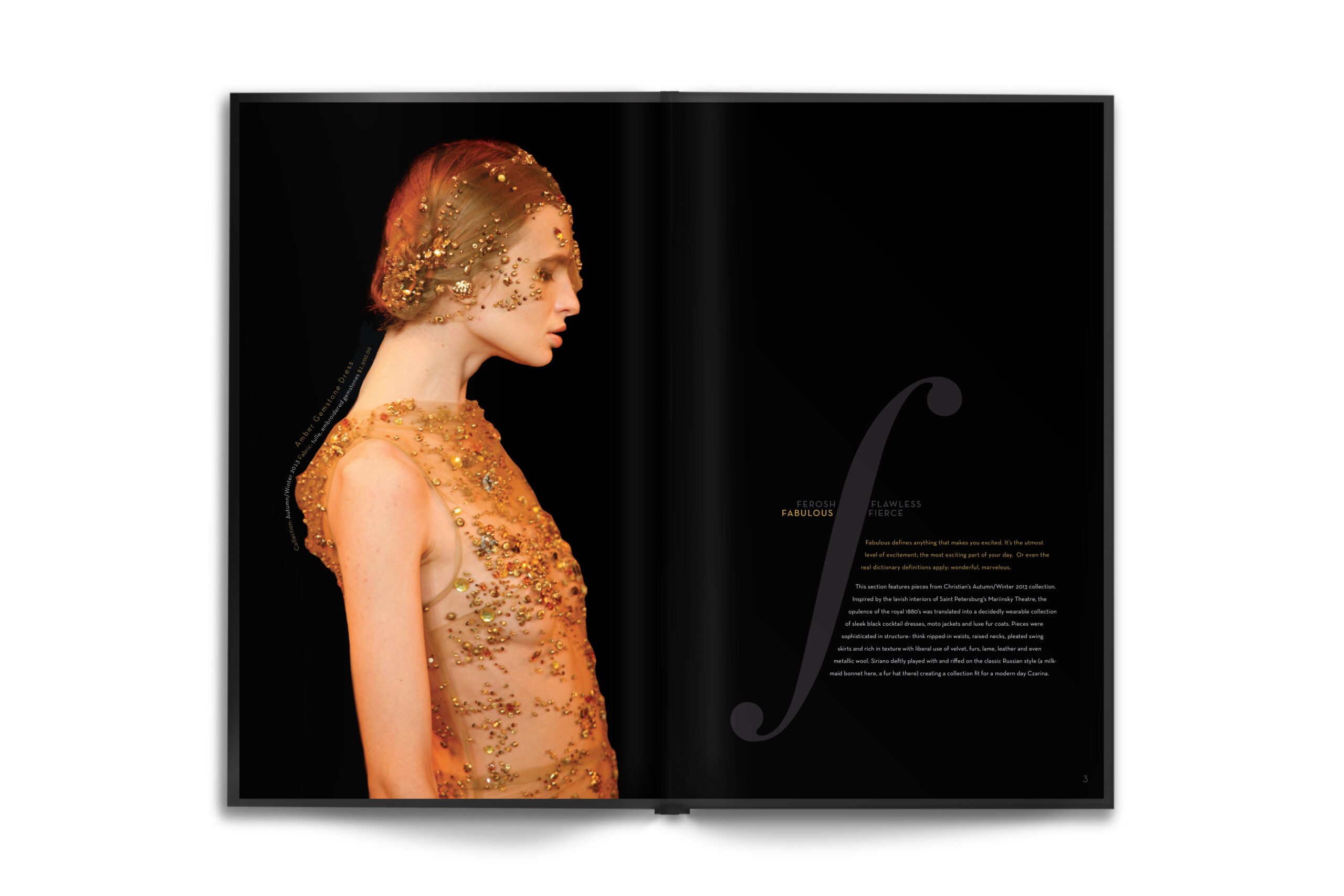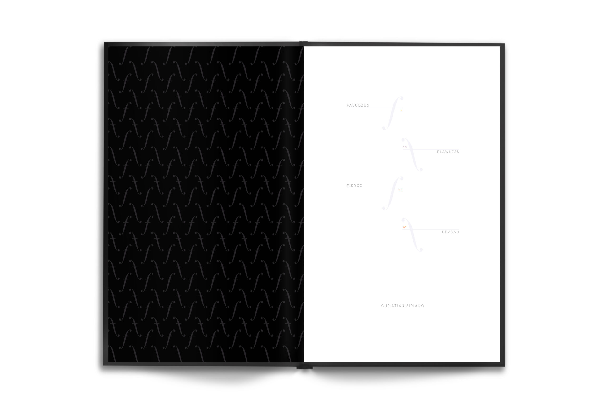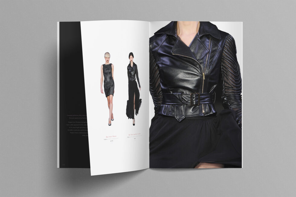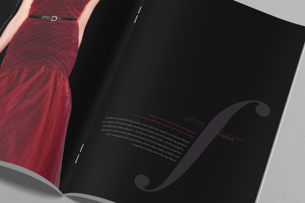 This fashion catalog categorizes seasonal collections by four of his favorite catchphrase praises: "fabulous, flawless, fierce, and ferosh." Each of these four sections of this catalog are carried through by the color scheme of each of these words. A minimalistic black and white background lets the bold colors of each collection stand out of every spread. The classy italic "f" pairs with a simple and elegant, sans serif that also adds, rather than distracts, from each fashion look.