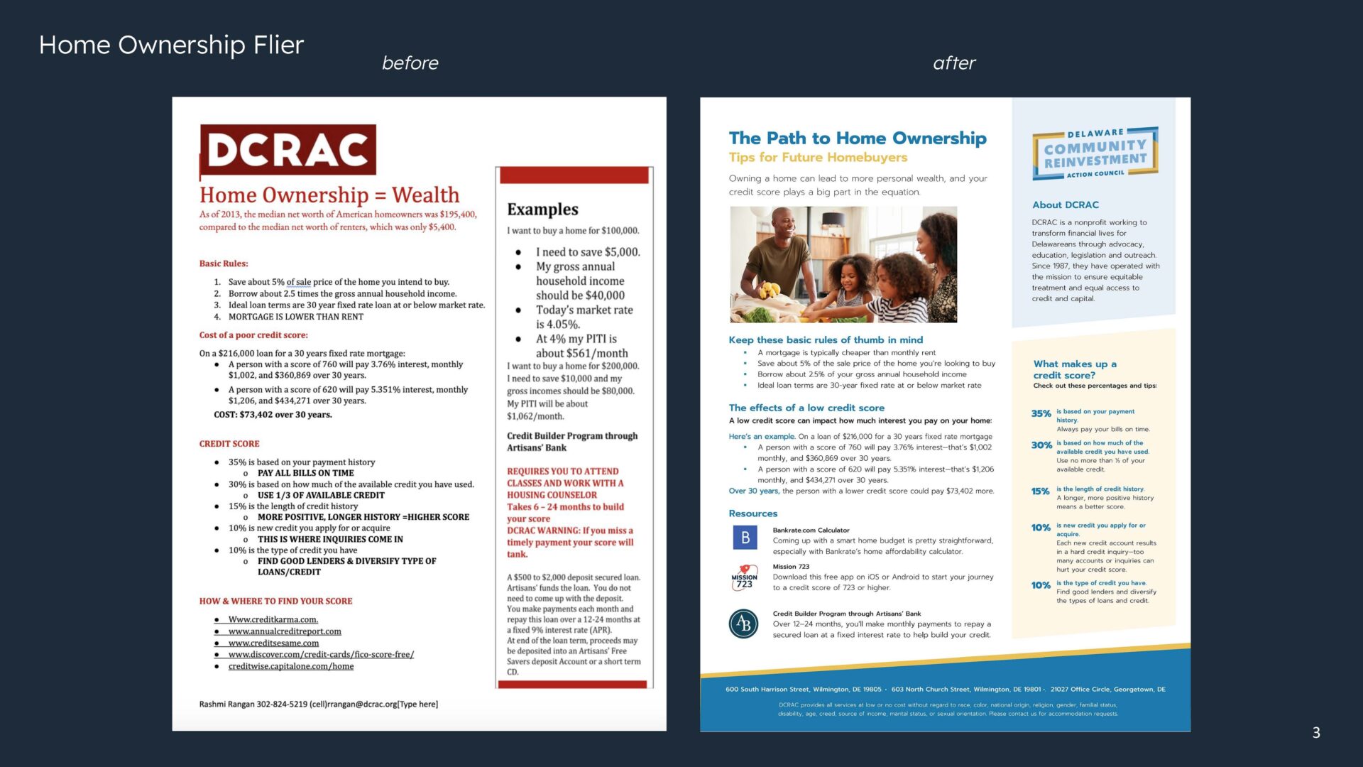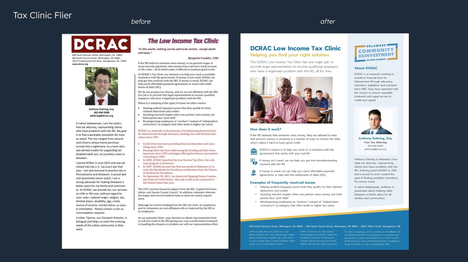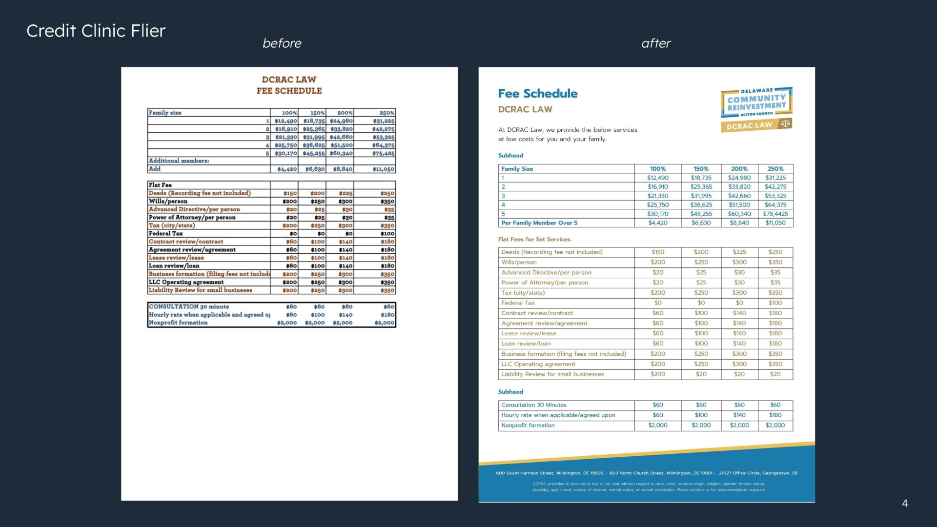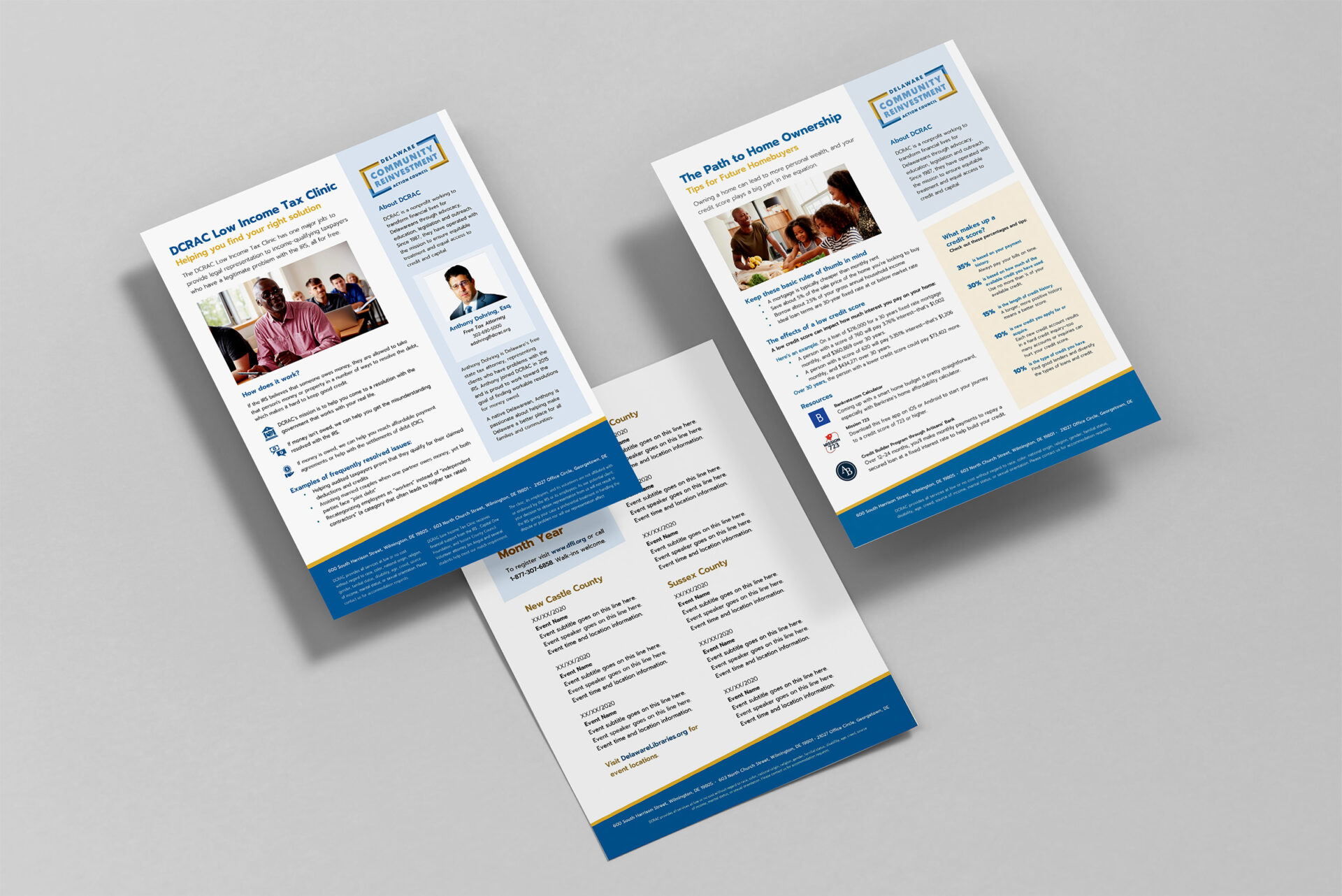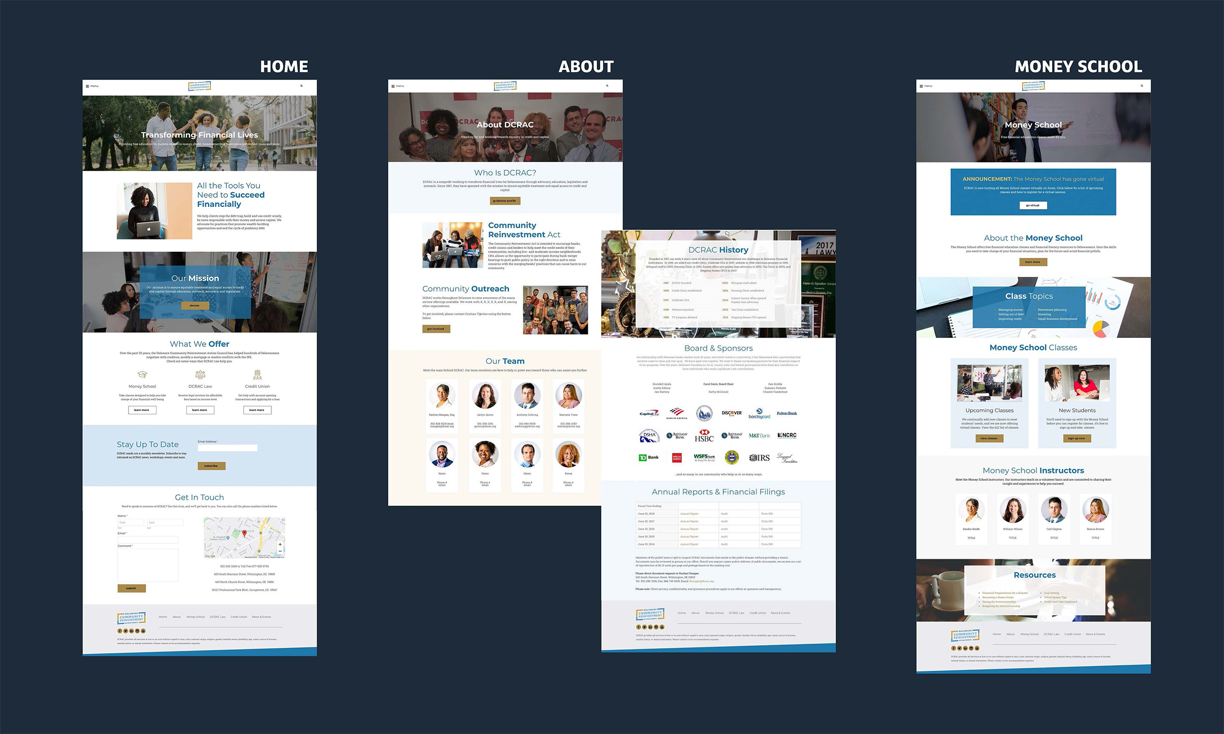 Our volunteer creative team discovered DCRAC's goal to "Transform Your Financial Life" encompassed four main pillars: the Stepping Stones Community Credit Union, The Money School, pro Bono legal services, and advocacy efforts in and around the greater Wilmington community. The team conducted a thorough audit of all of DCRAC's current assets—including print collateral, their website, and social media presence. From the audit, we identified three areas of focus: brand identity, messaging strategy and hierarchy, and social media guidance and best practices.
