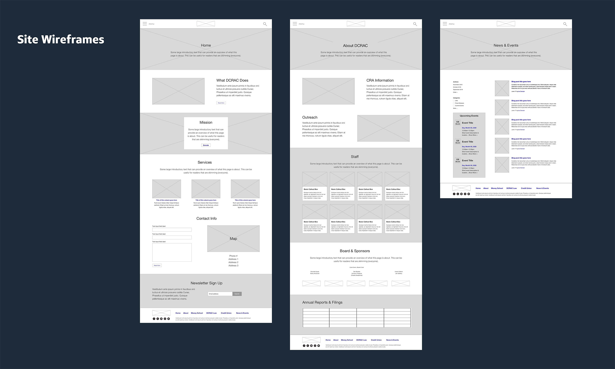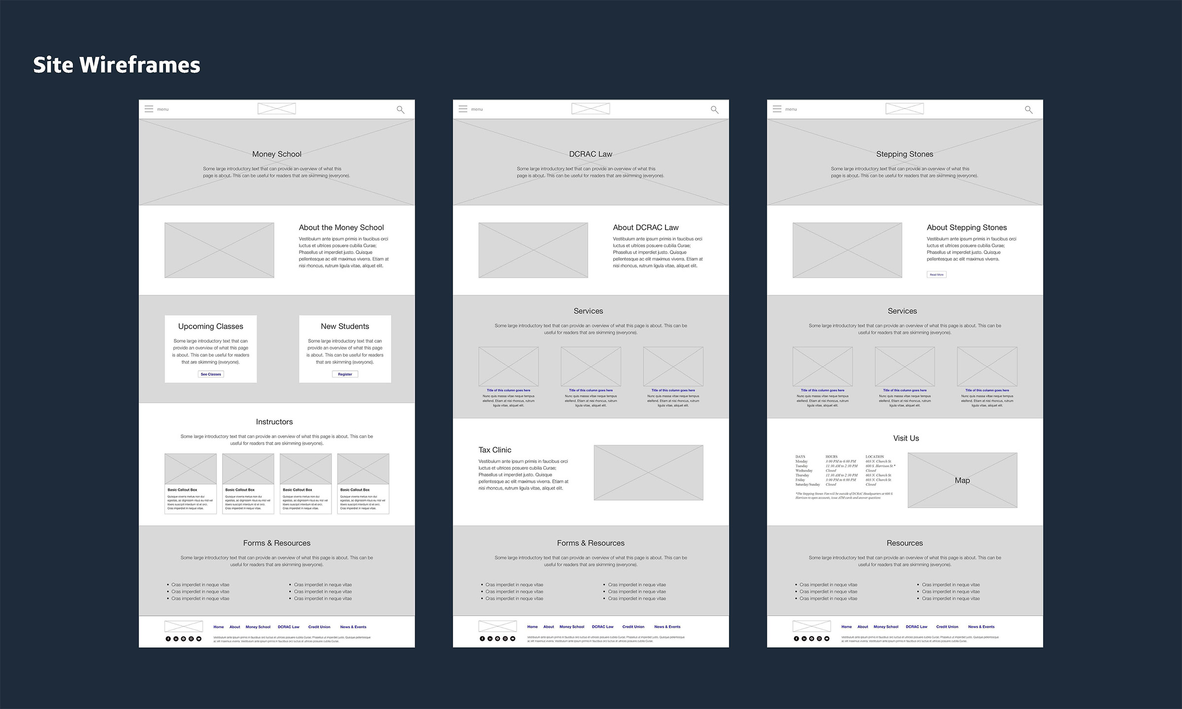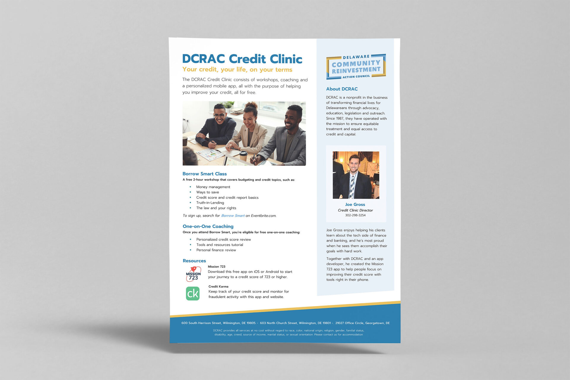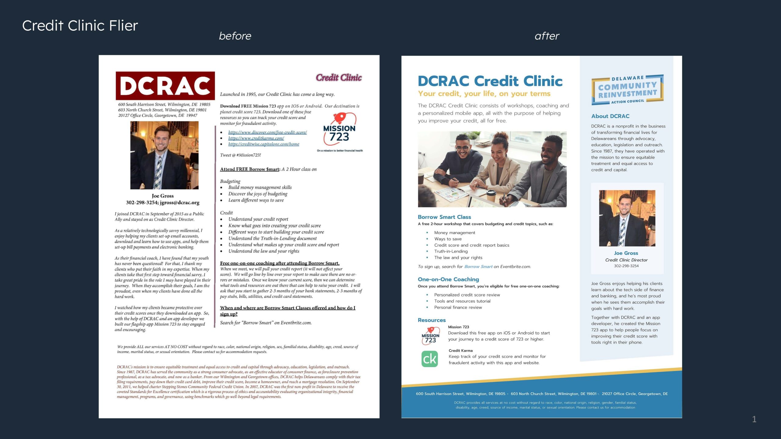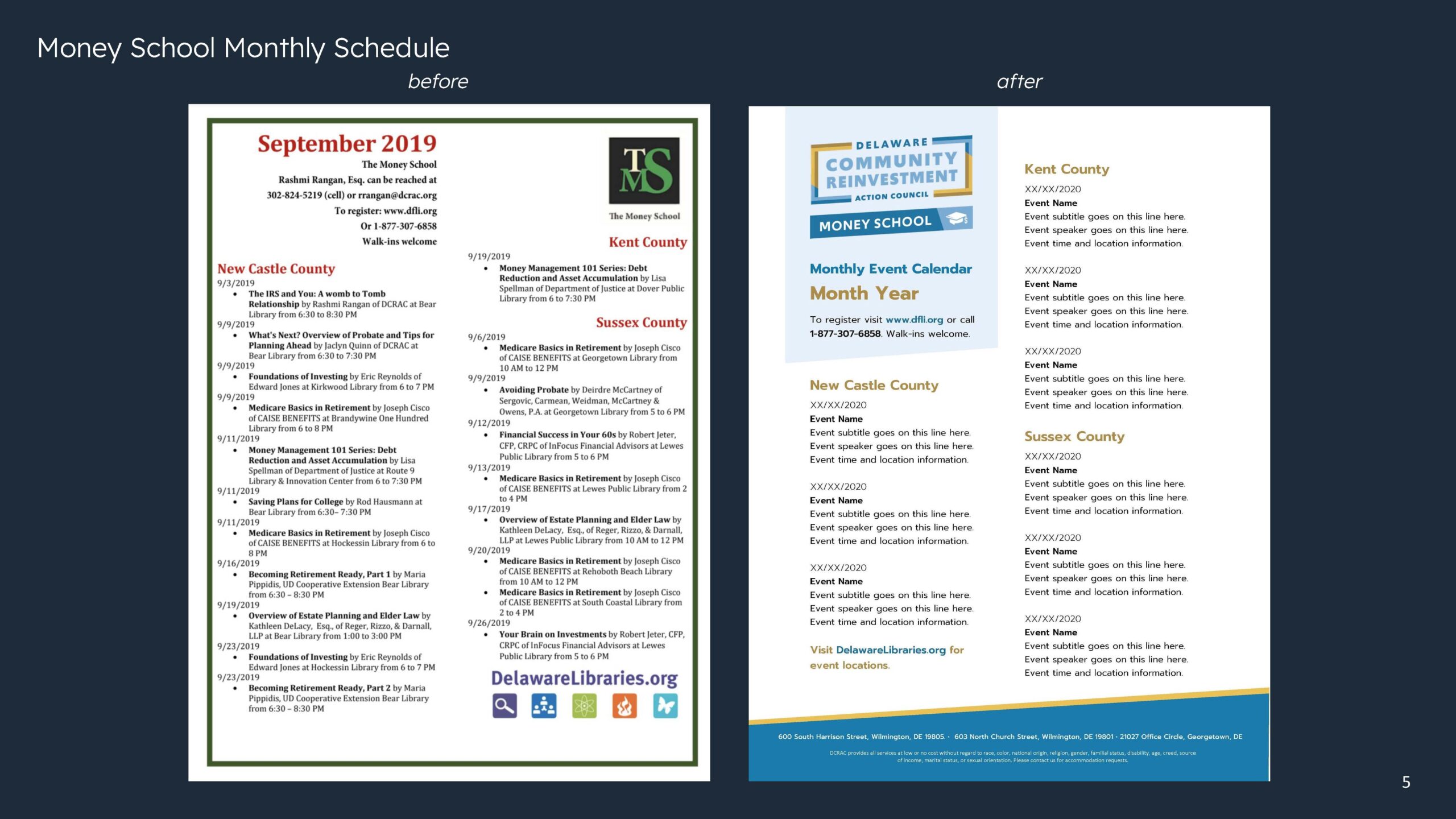 Our volunteer creative team discovered DCRAC's goal to "Transform Your Financial Life" encompassed four main pillars: the Stepping Stones Community Credit Union, The Money School, pro Bono legal services, and advocacy efforts in and around the greater Wilmington community. The team conducted a thorough audit of all of DCRAC's current assets—including print collateral, their website, and social media presence. From the audit, we identified three areas of focus: brand identity, messaging strategy and hierarchy, and social media guidance and best practices.