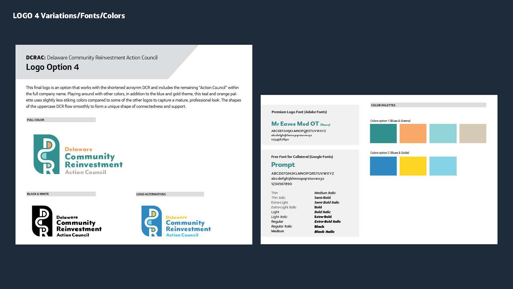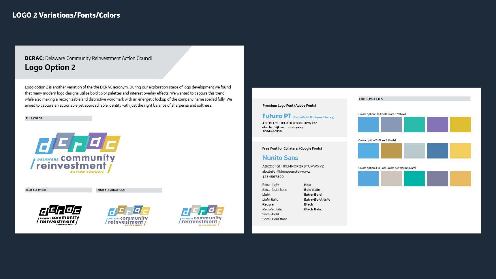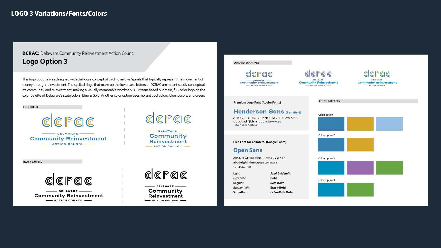 My explorations led me to trying a couple of distinct color palettes, shapes visuals and typesetting. Colors palettes were inspired by similar organizations and Delaware's state colors of Colonial Blue (a shade of blue) and Buff (a light tan/beige color). We also experimented with options that didn't rely on the "DCRAC" acroynm, shortened the acroynm, and fully inlcuded it. See each logo variation page for details on the different approaches