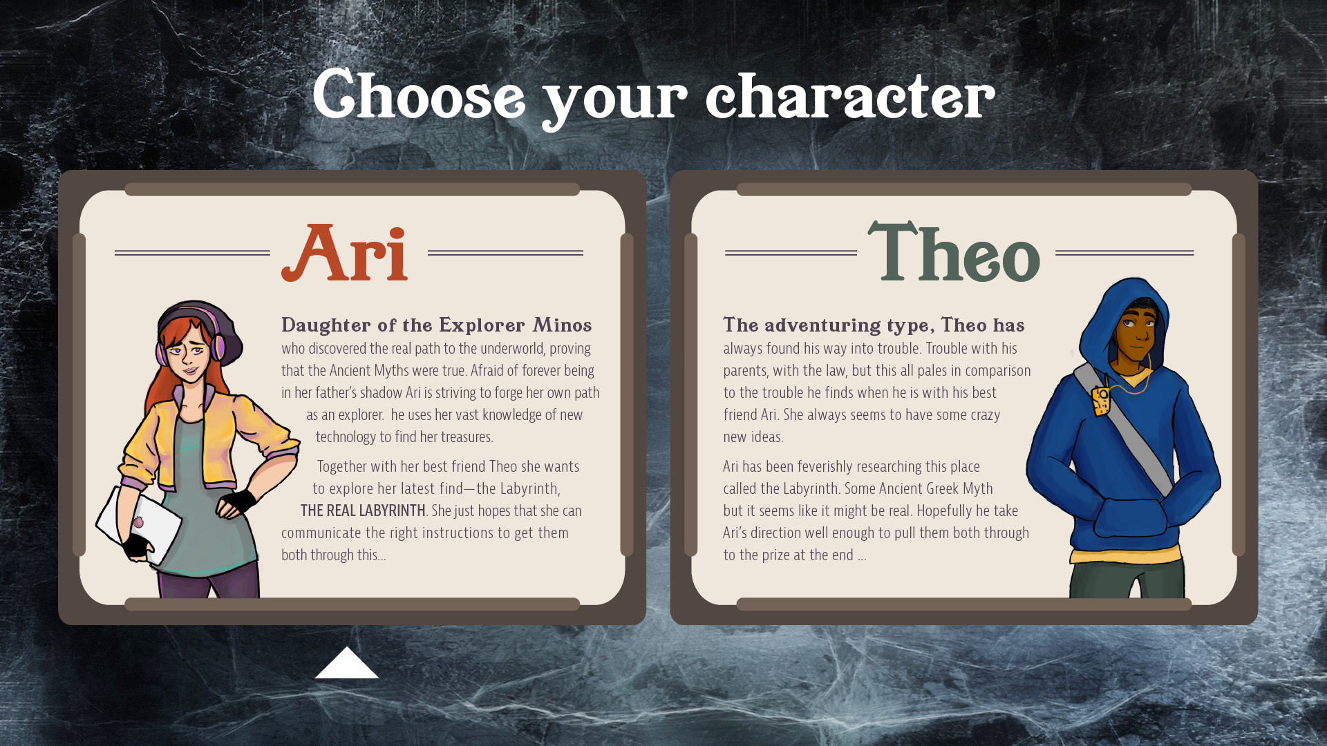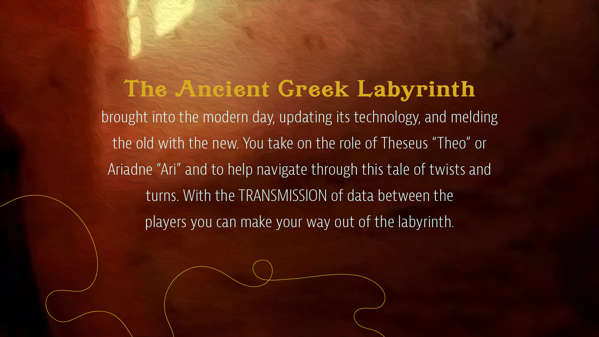 “The Ancient Greek Labyrinth brought into the modern day, updating its technology, and melding the old with the new. You take on the role of Theseus “Theo” or Ariadne “Ari” and to help navigate through this tale of twists and turns. With the transmission of data between the players you can make your way out of the labyrinth.”