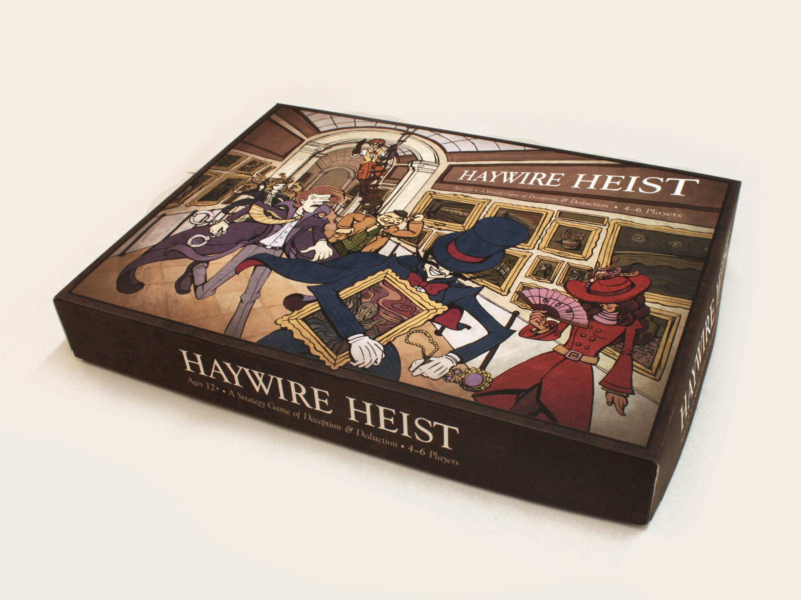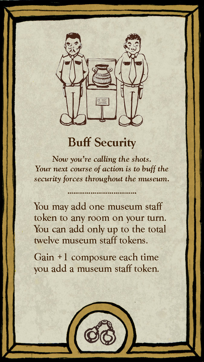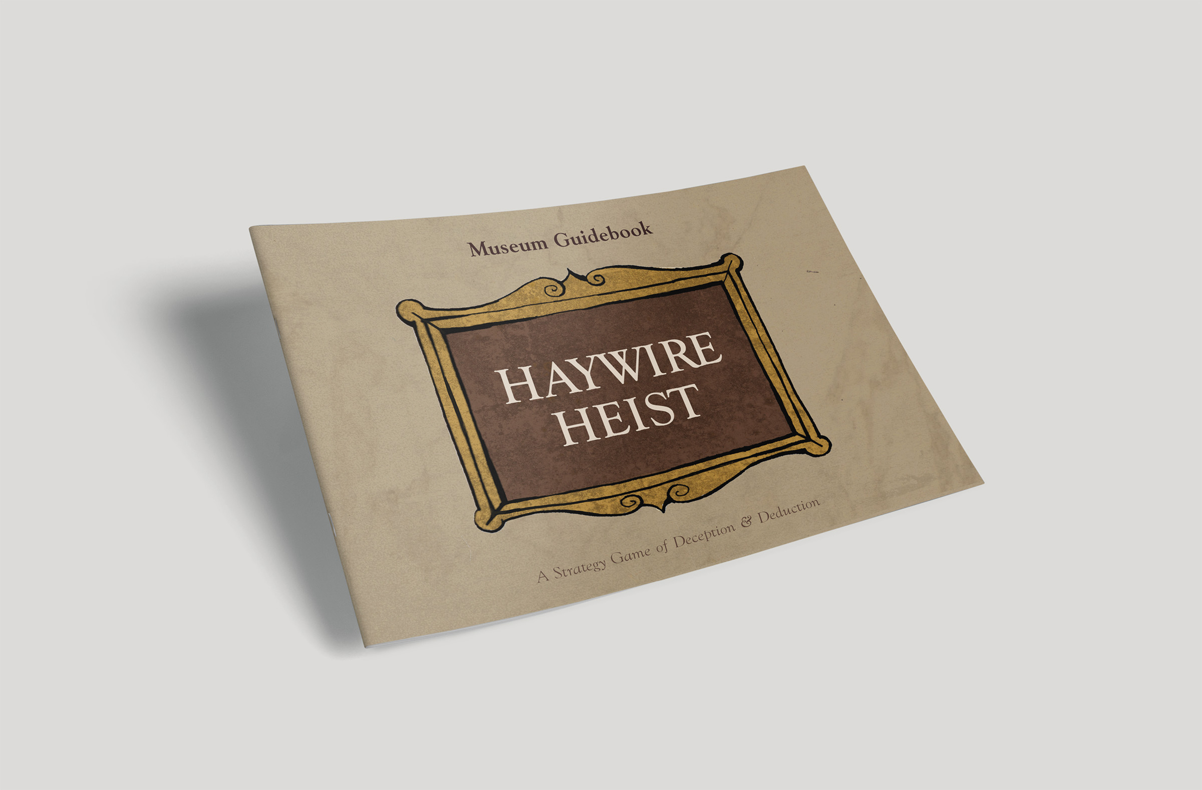 Haywire Heist features a stylized illustration style with bold, inked outlines, flat rendering with subtle marbled textures that balance an antiquated atmosphere with a lively, modern personality. The traditional, earthy "museum" color palette blends with the environmental elements, room layouts, and card art with the much more vibrant colors and designs for the playable characters. In other words, a style that encompasses "old meets new." Likewise, the typography uses a traditional serif to provide contrast to the contemporary illustration style.