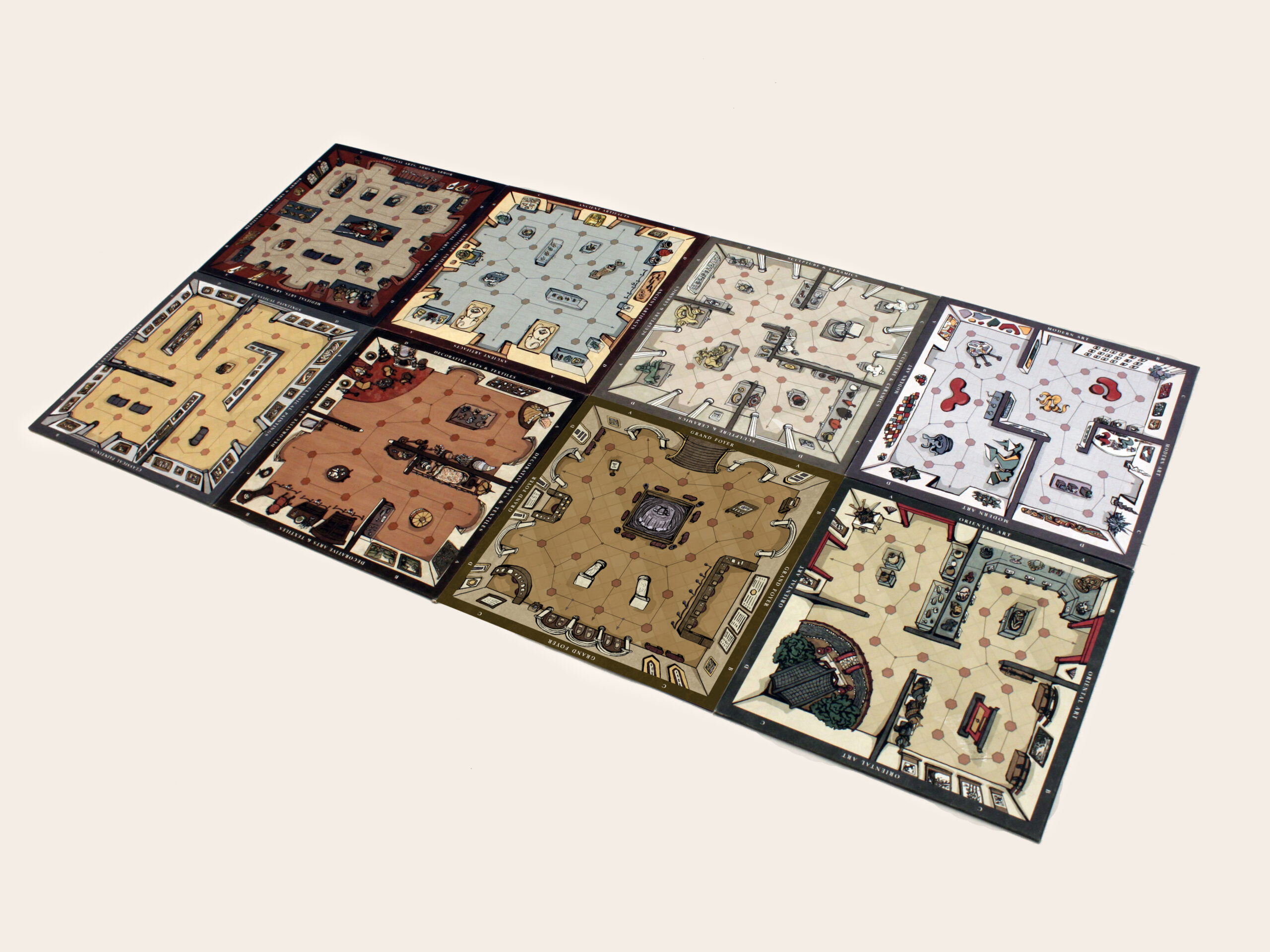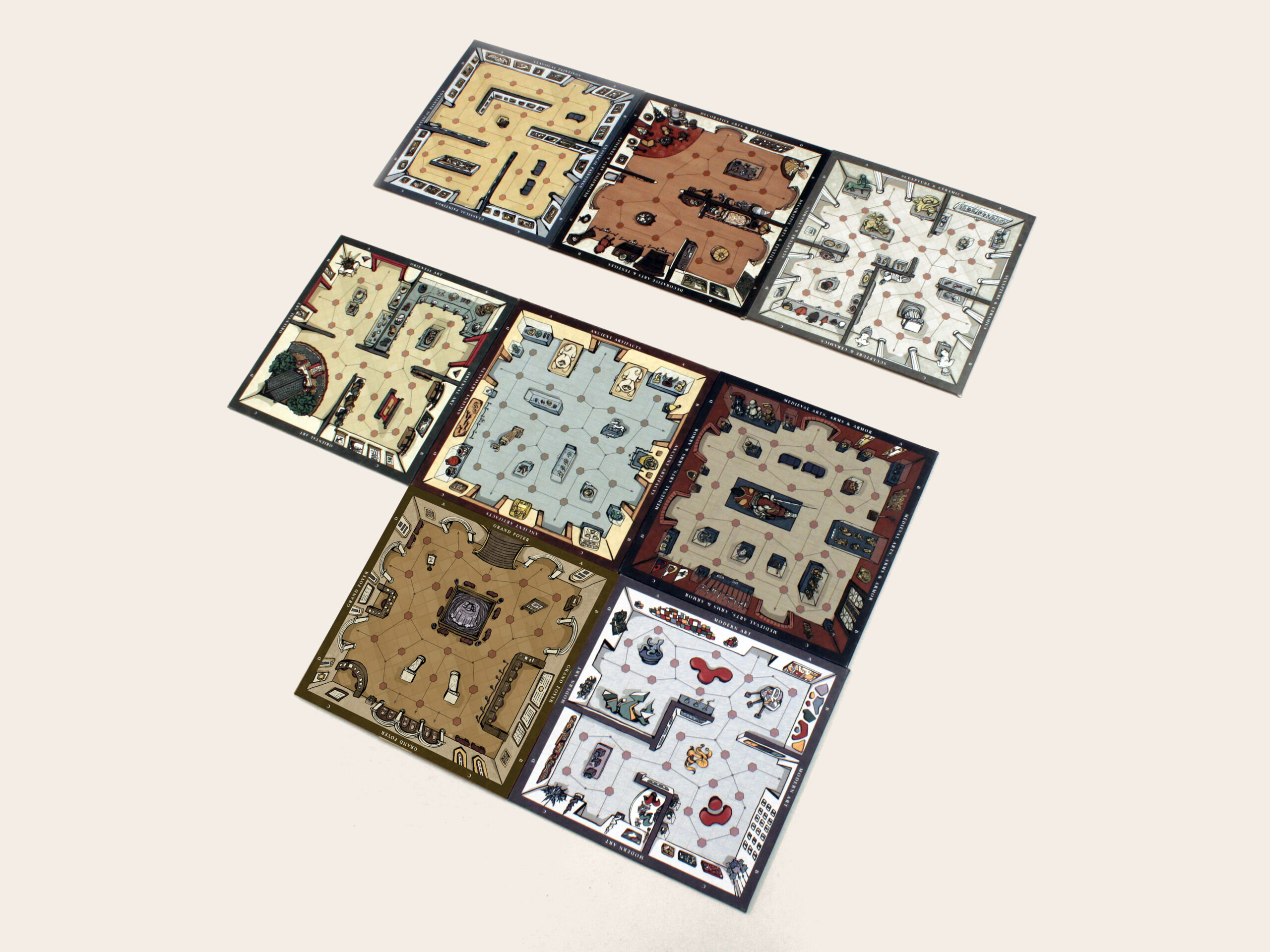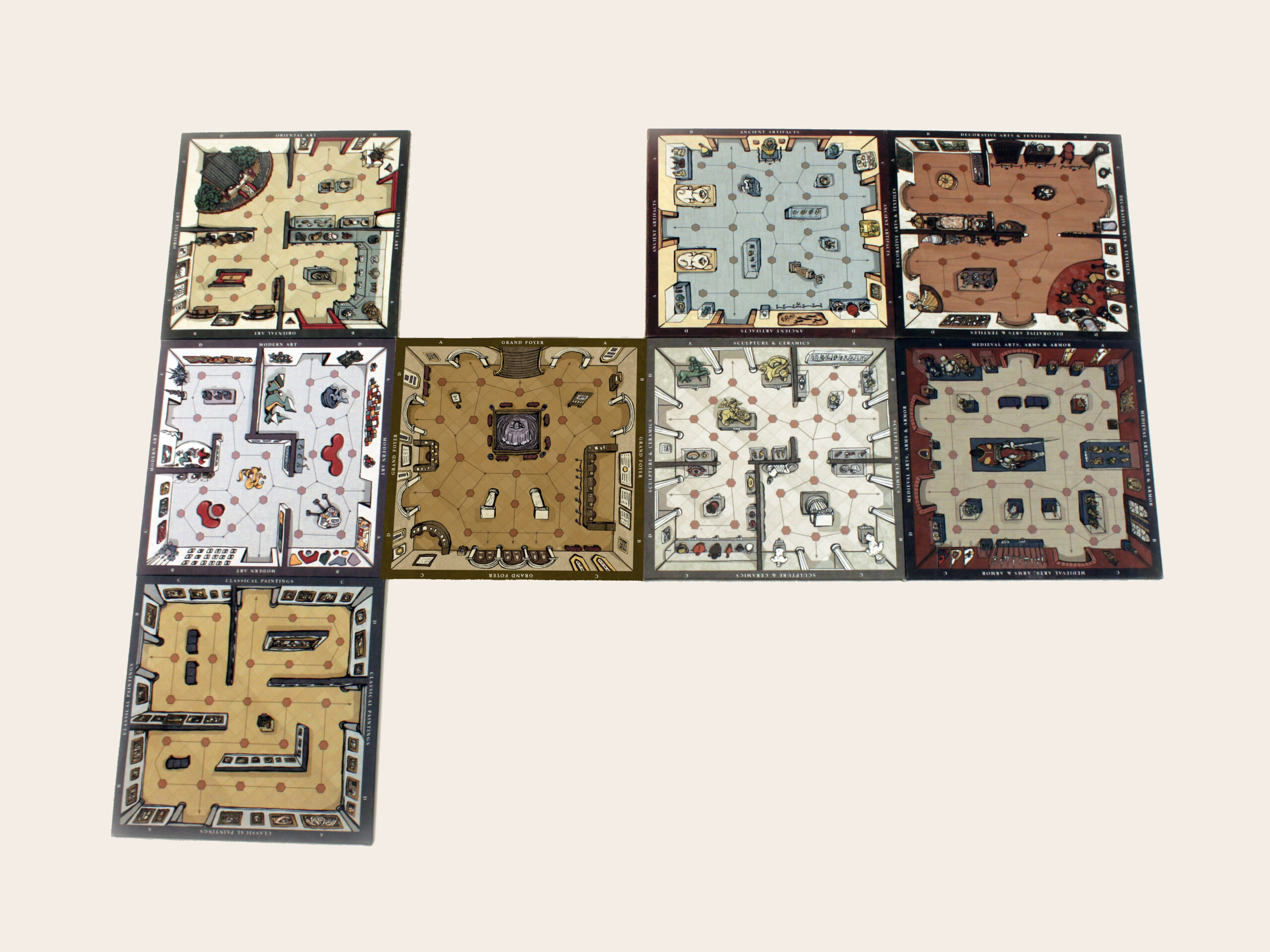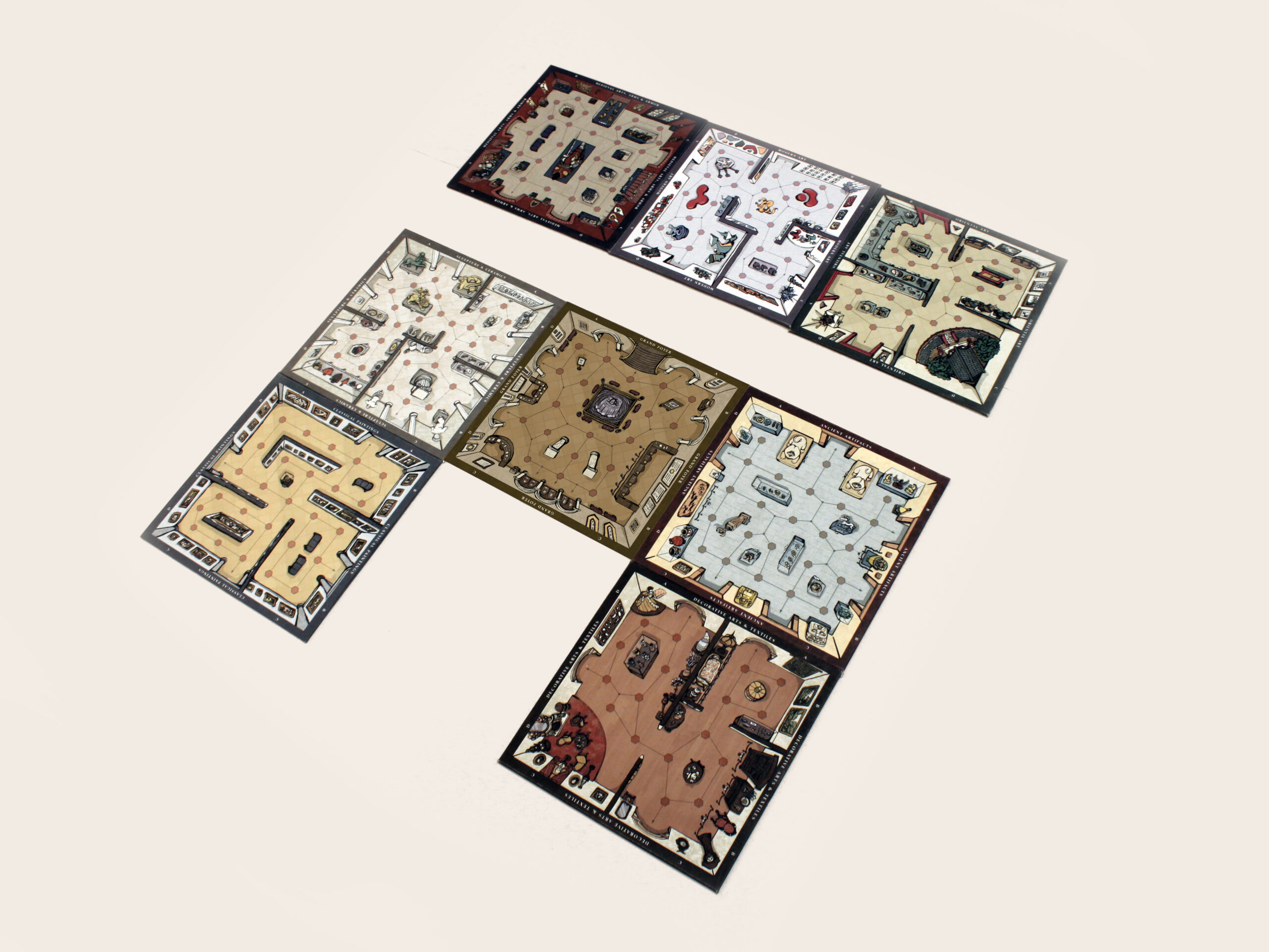 This board game uses a modular room board system with eight base tiles featuring the various art and antiquity wings of a museum. Different confiurations of these tiles allow for a range of difficulties and a unique play experience for every game.