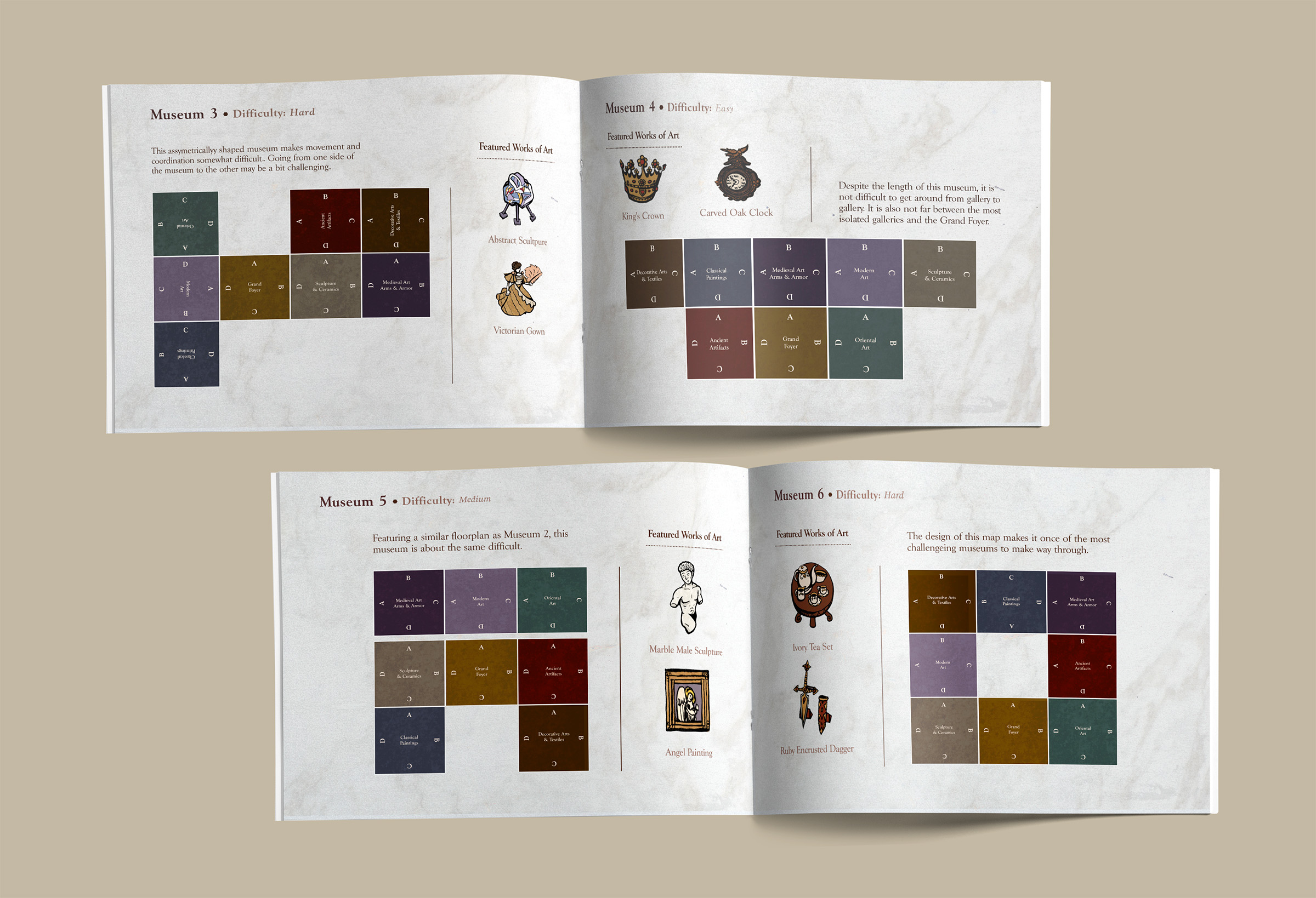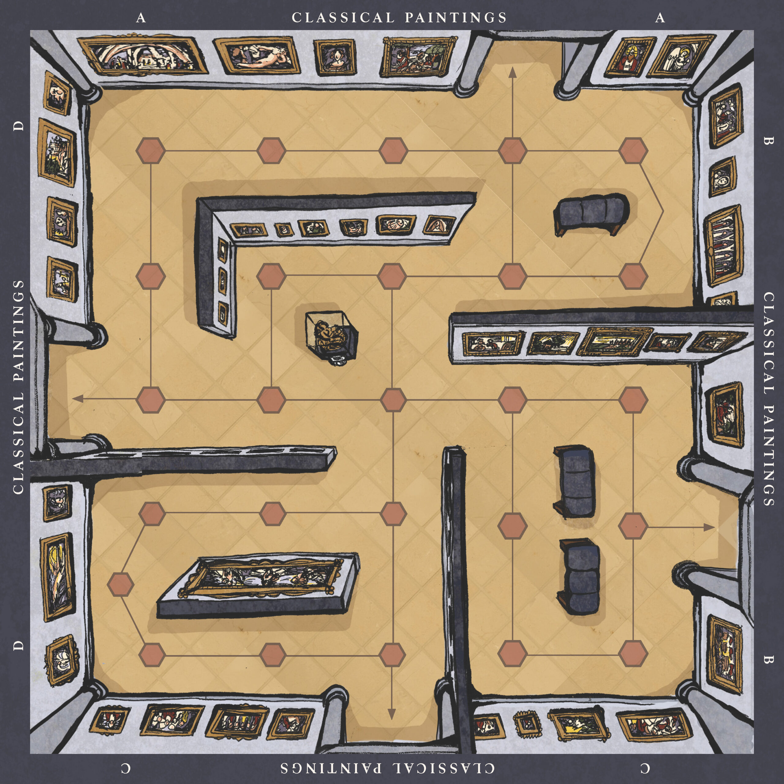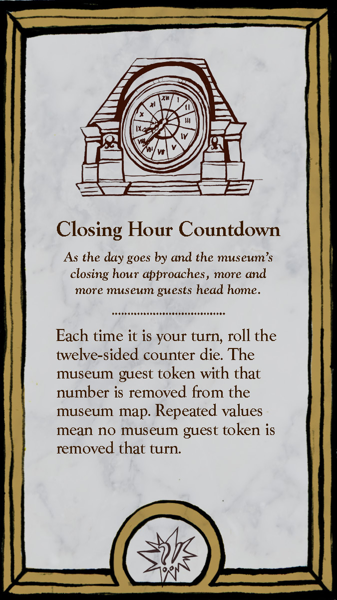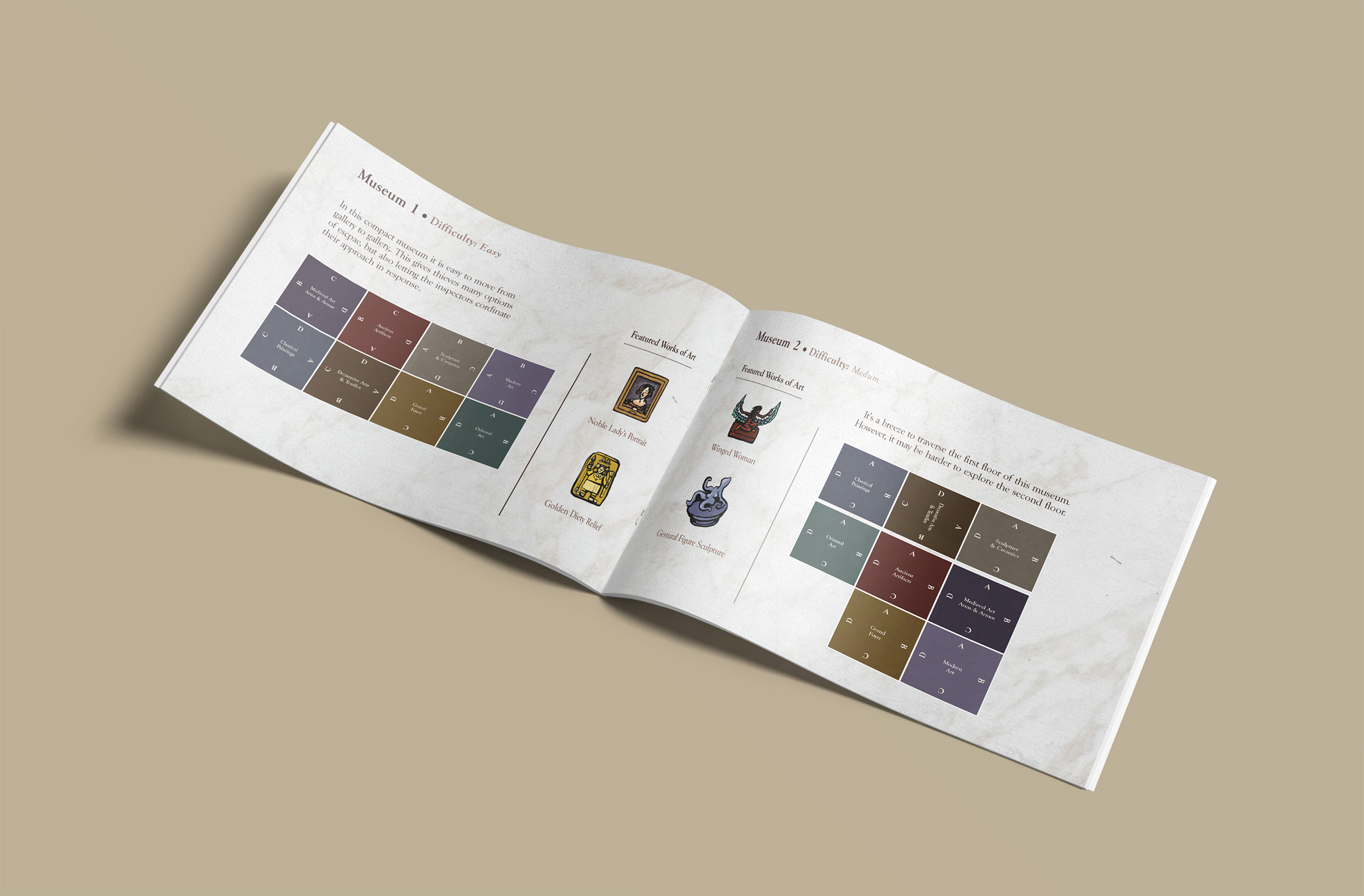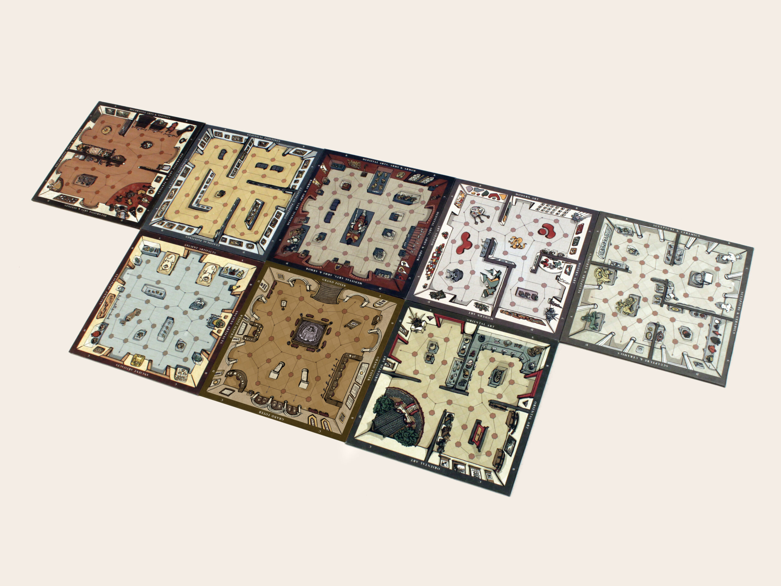 This board game uses a modular room board system with eight base tiles featuring the various art and antiquity wings of a museum. Different confiurations of these tiles allow for a range of difficulties and a unique play experience for every game.