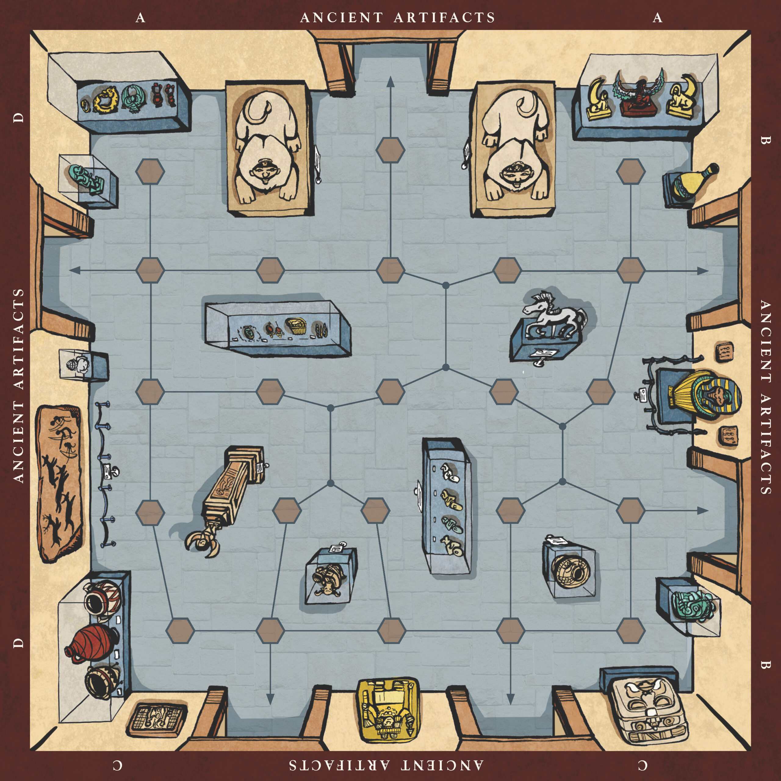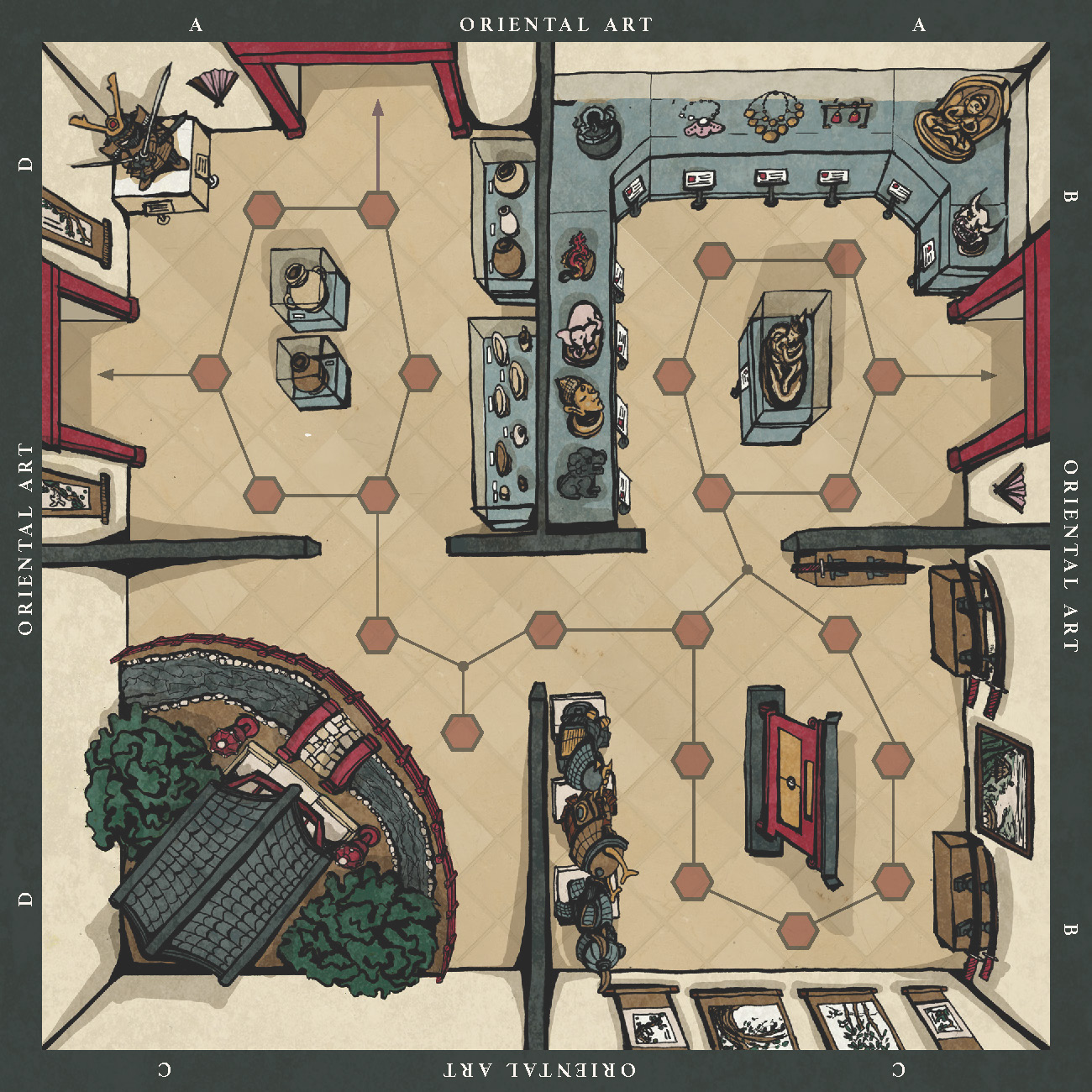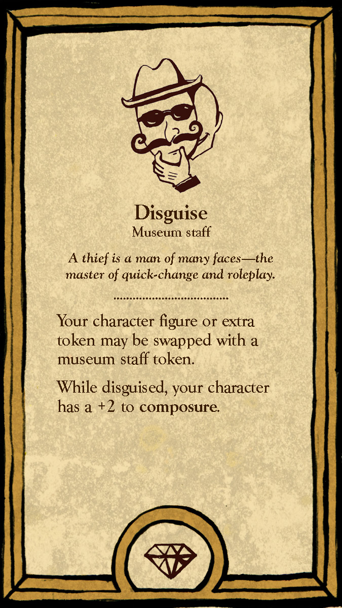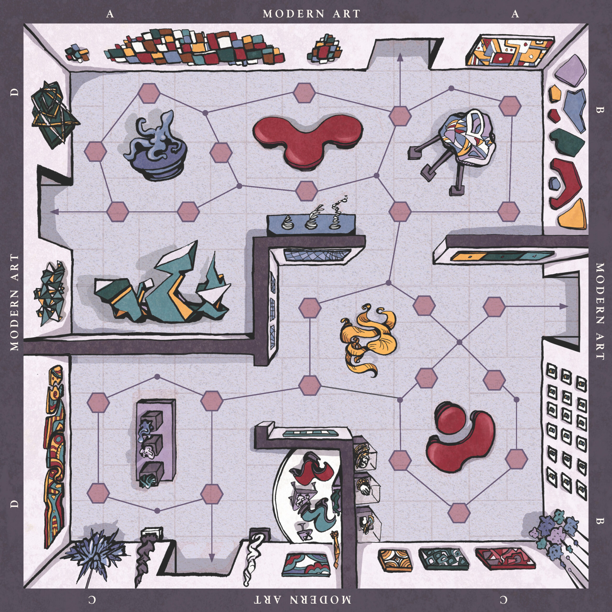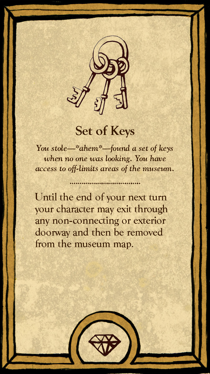 This board game uses a modular room board system with eight base tiles featuring the various art and antiquity wings of a museum. Different confiurations of these tiles allow for a range of difficulties and a unique play experience for every game.