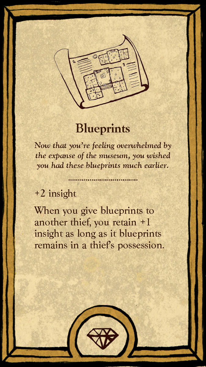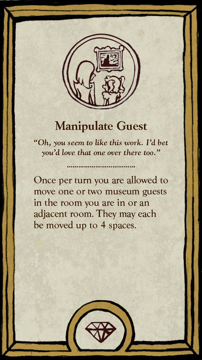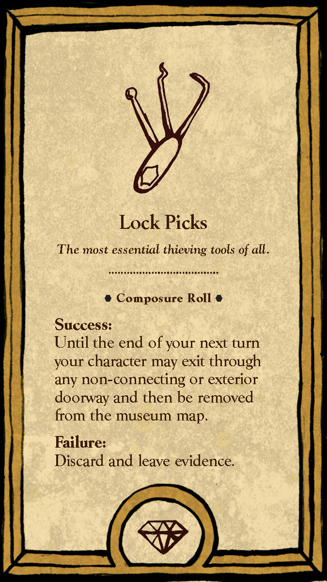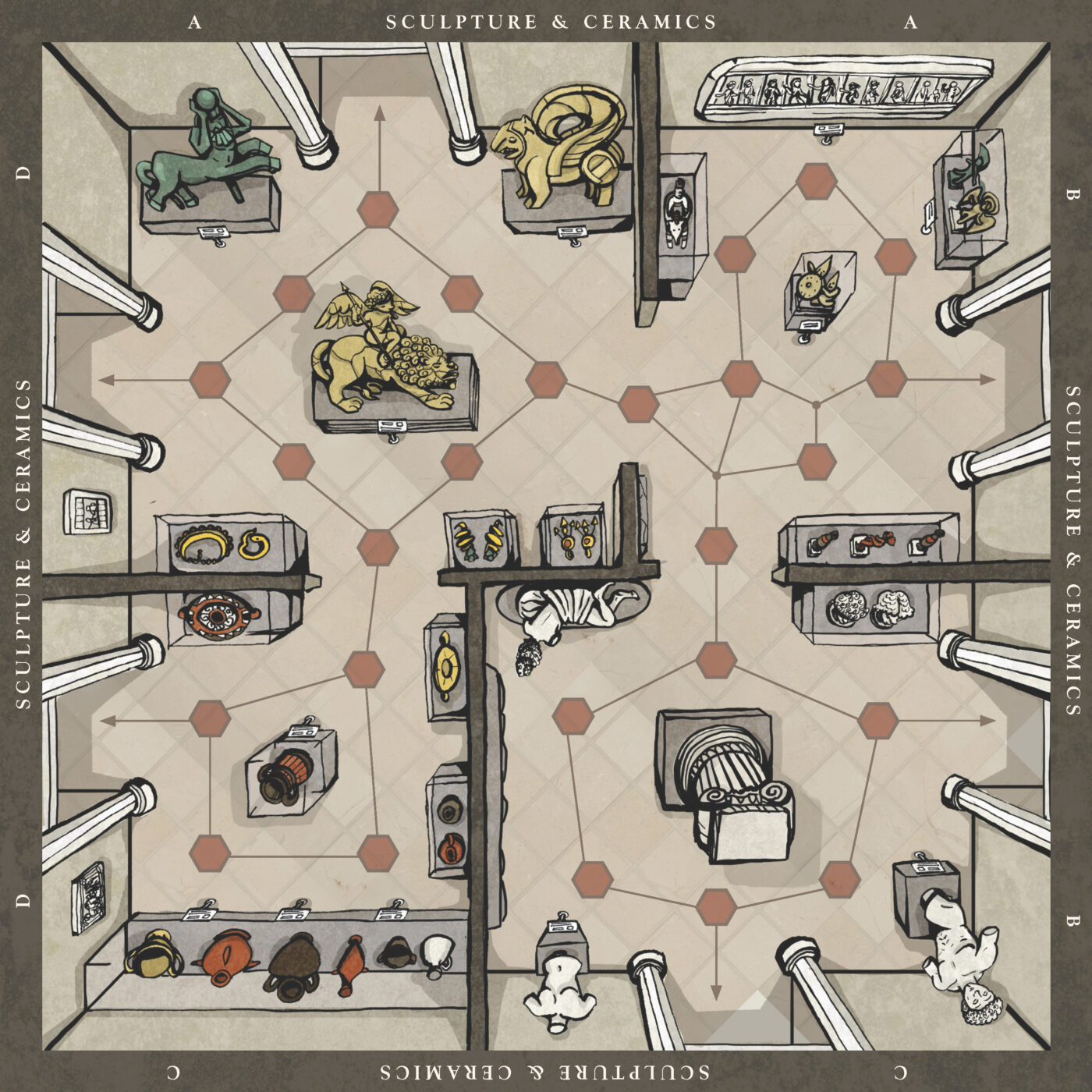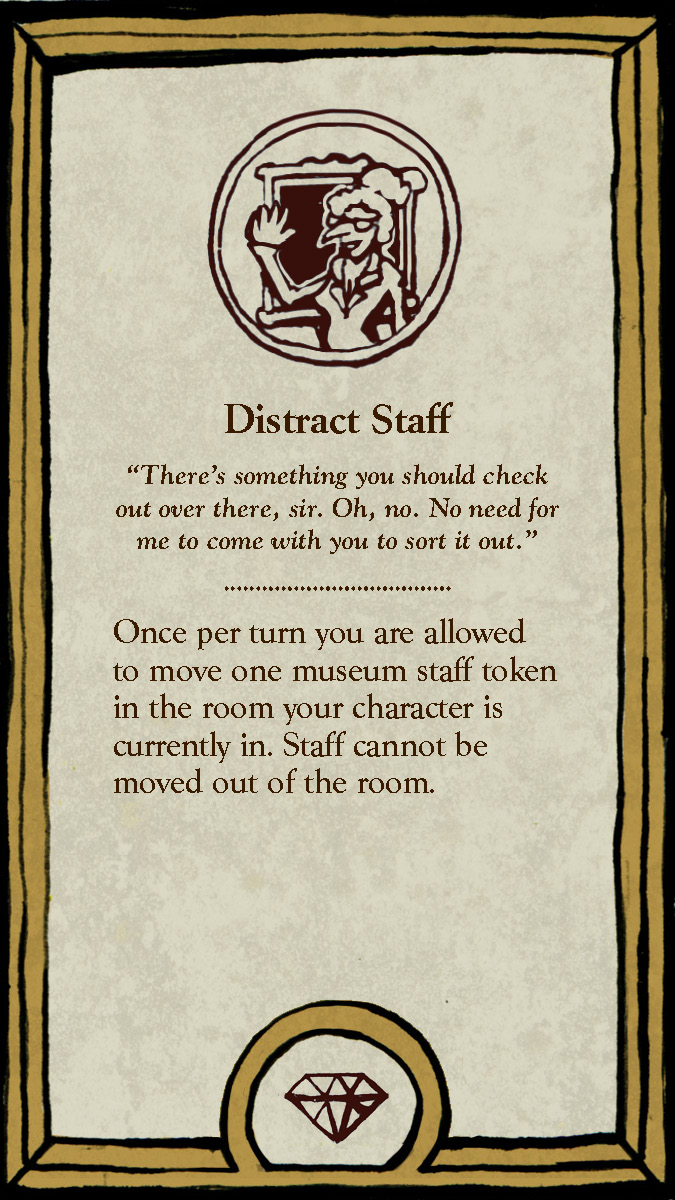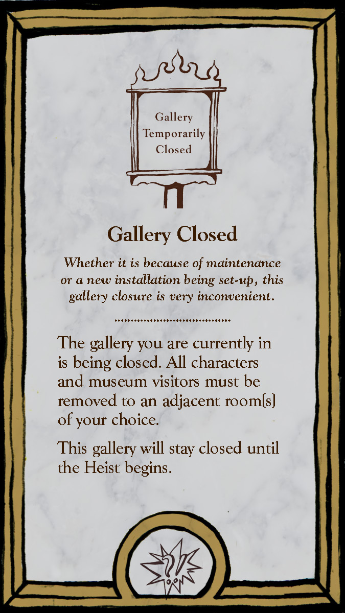 This board game uses a modular room board system with eight base tiles featuring the various art and antiquity wings of a museum. Different confiurations of these tiles allow for a range of difficulties and a unique play experience for every game.