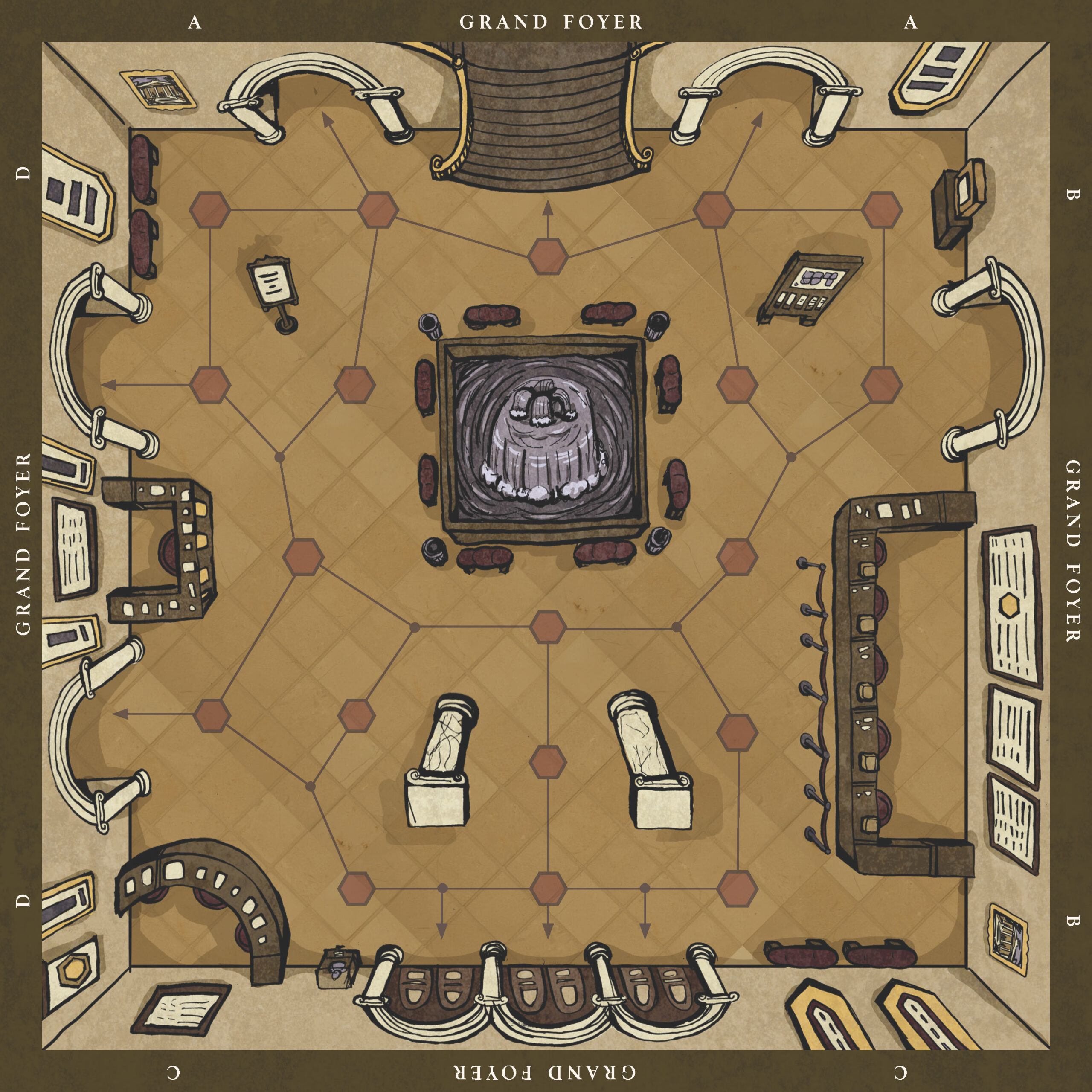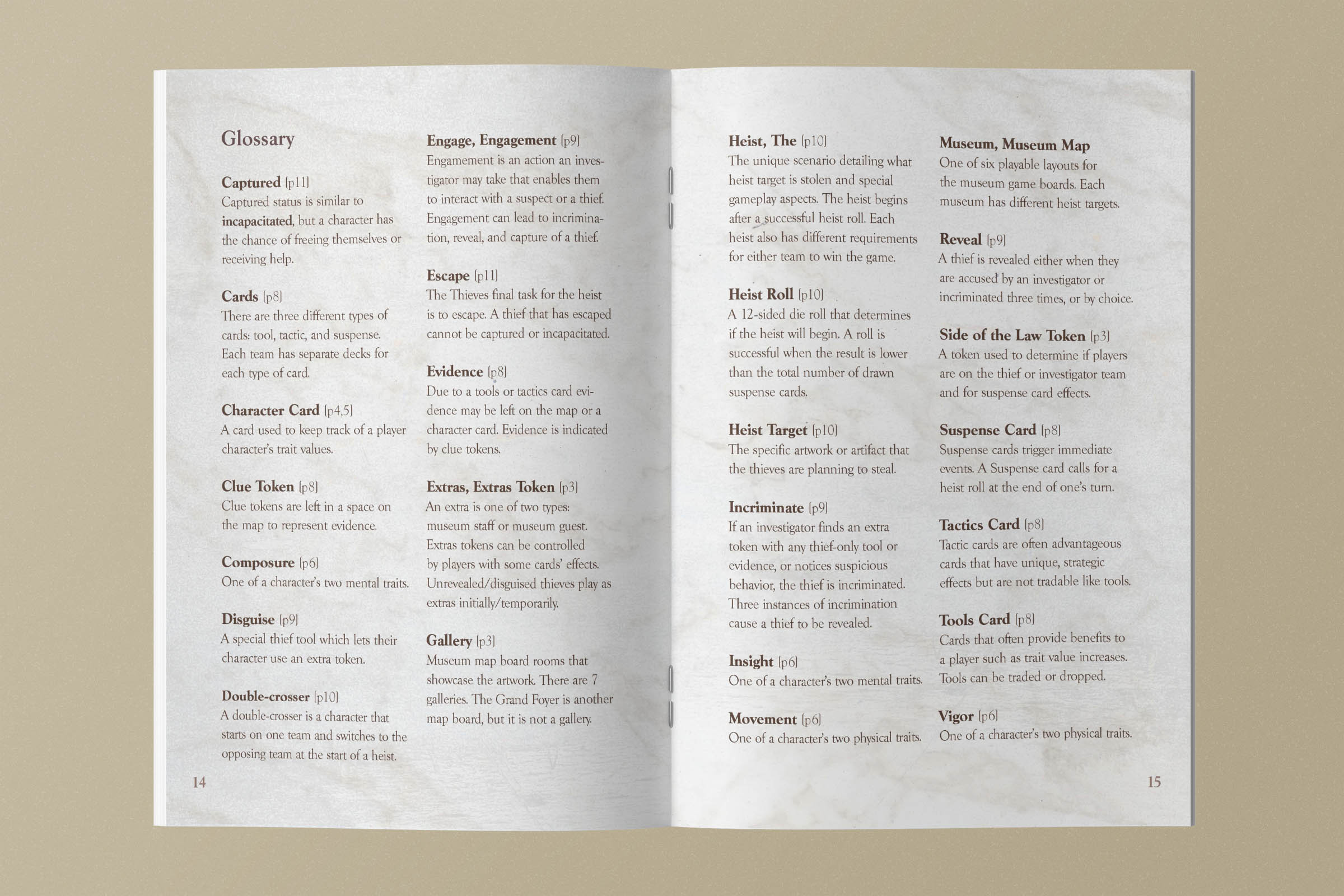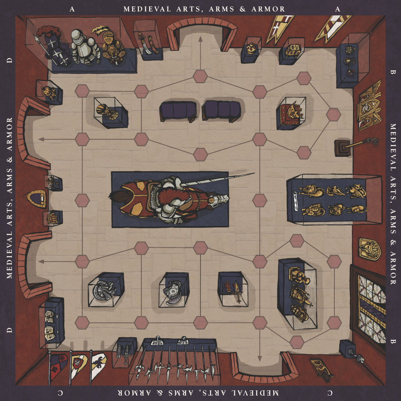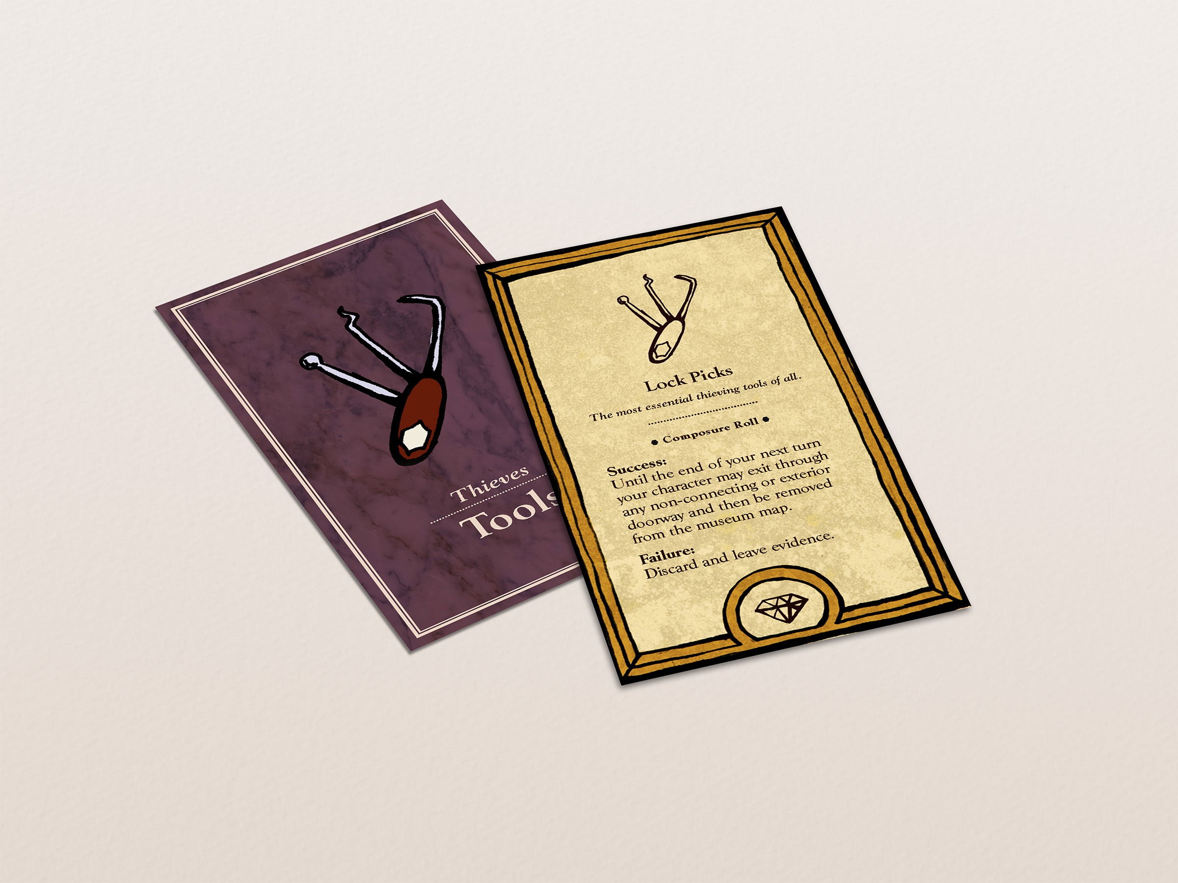 This board game uses a modular room board system with eight base tiles featuring the various art and antiquity wings of a museum. Different confiurations of these tiles allow for a range of difficulties and a unique play experience for every game.