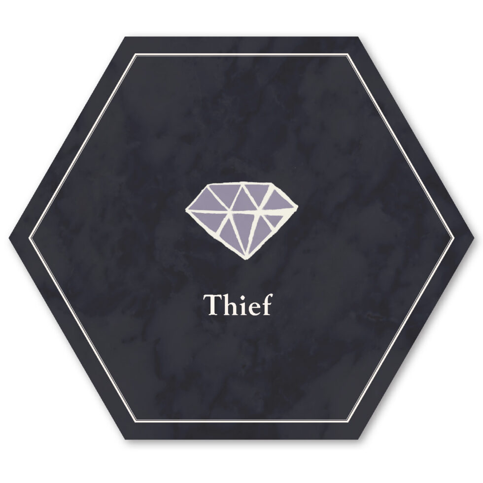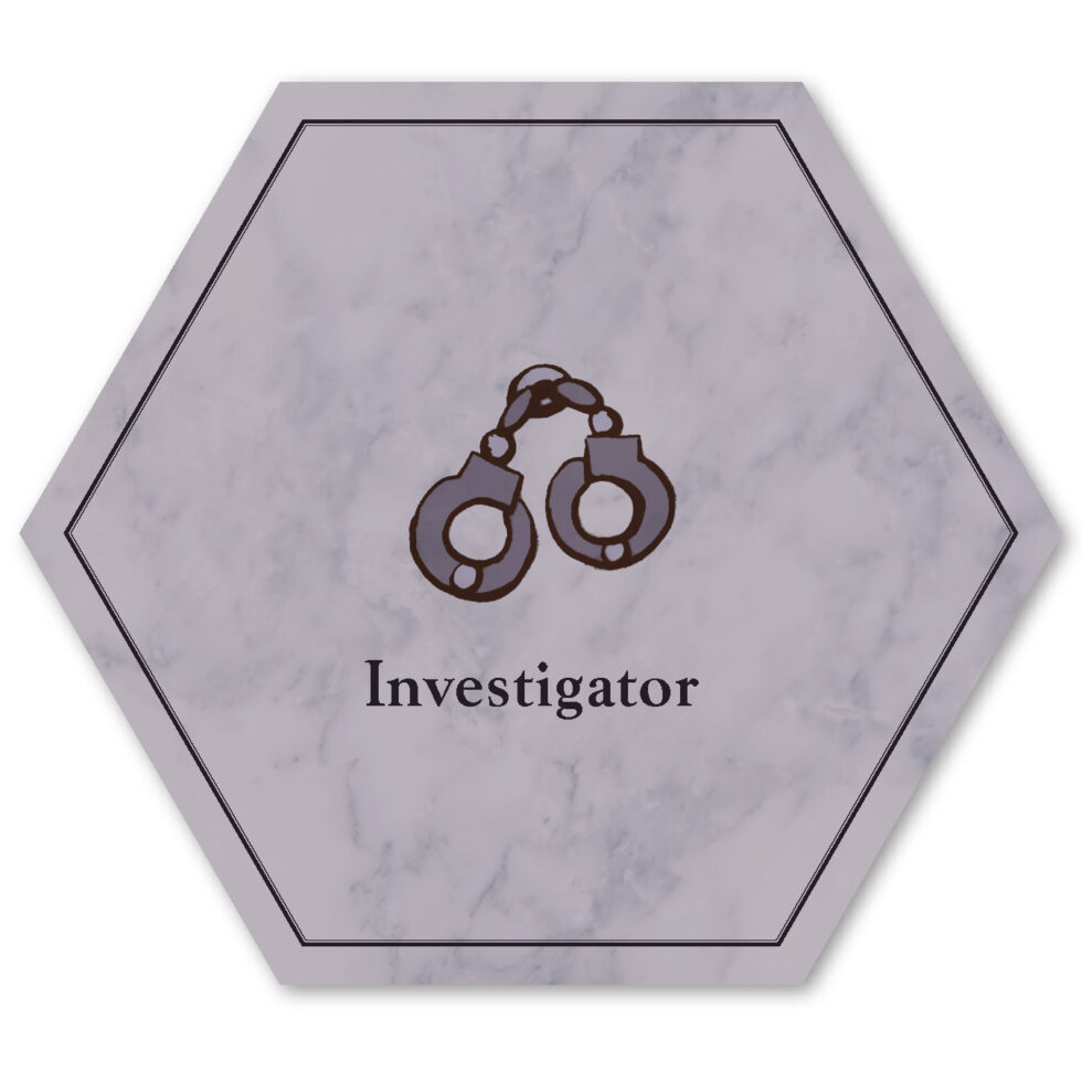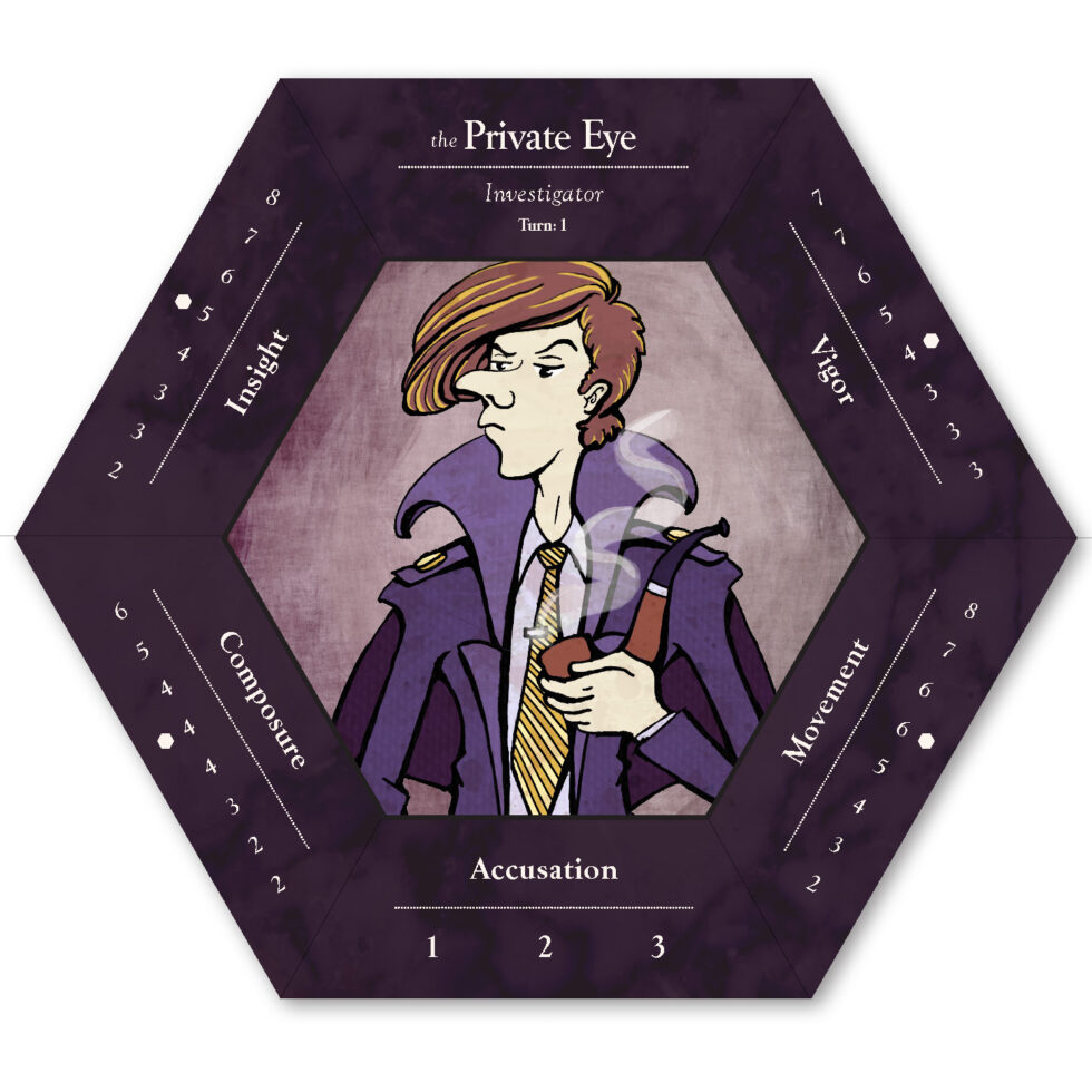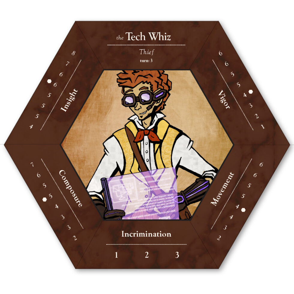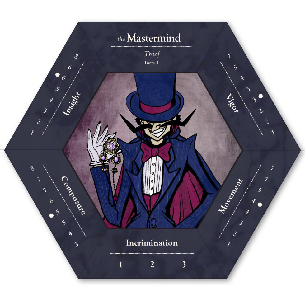 The six playable characters, three from the Thieves team and three from the Investigators team all have a unique primary color and starting trait points. The character cards help players keep track of increases and decreases to their stats, incrimination, or accusation as various tools, strategies, or suspense cards come into play.