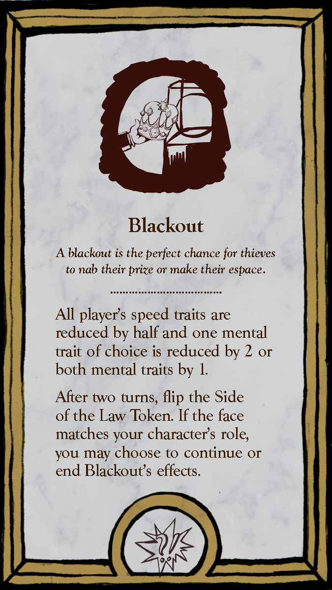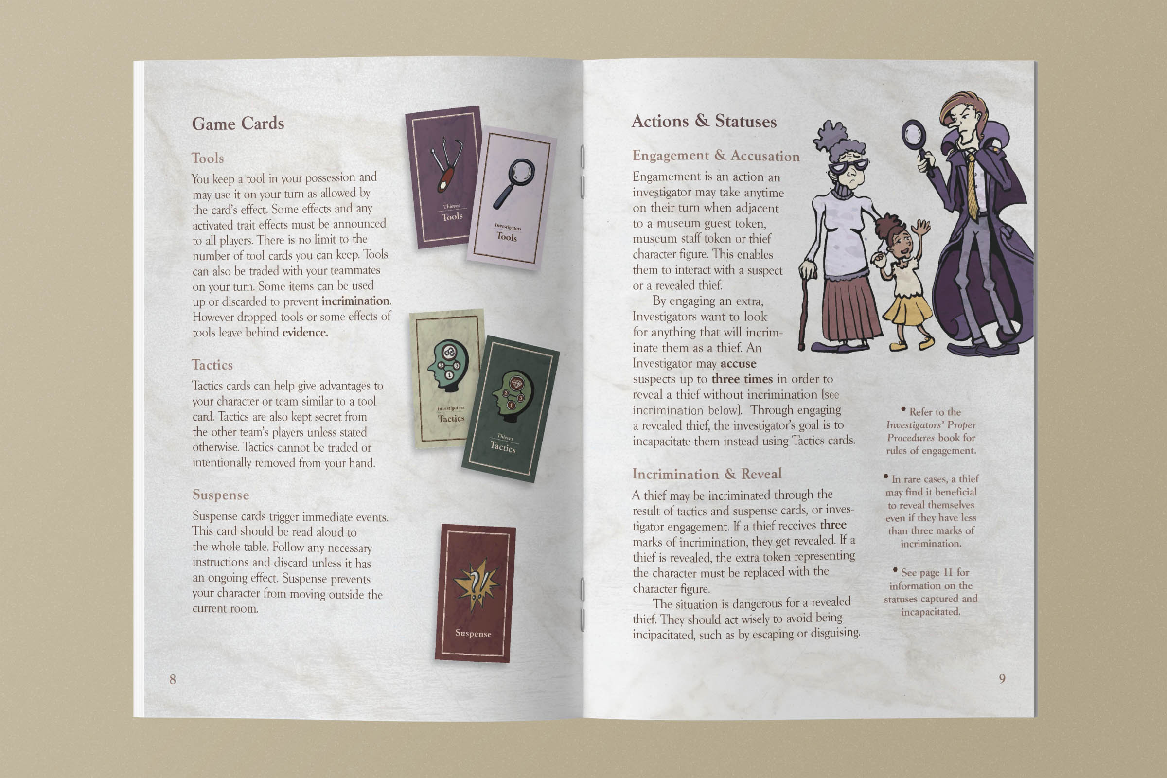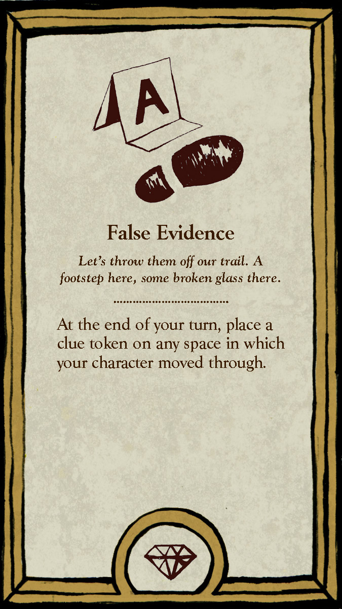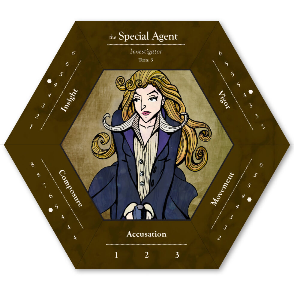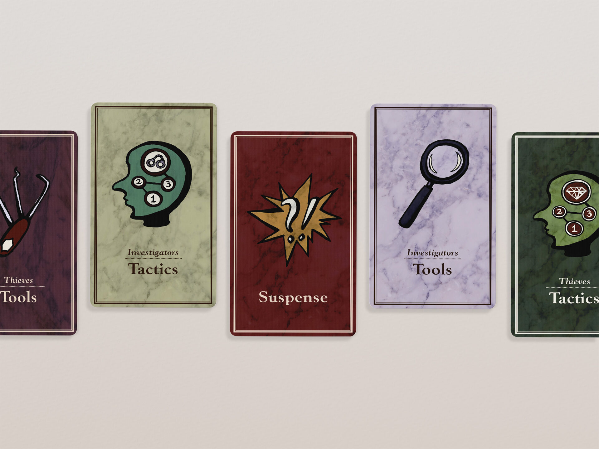 The six playable characters, three from the Thieves team and three from the Investigators team all have a unique primary color and starting trait points. The character cards help players keep track of increases and decreases to their stats, incrimination, or accusation as various tools, strategies, or suspense cards come into play.