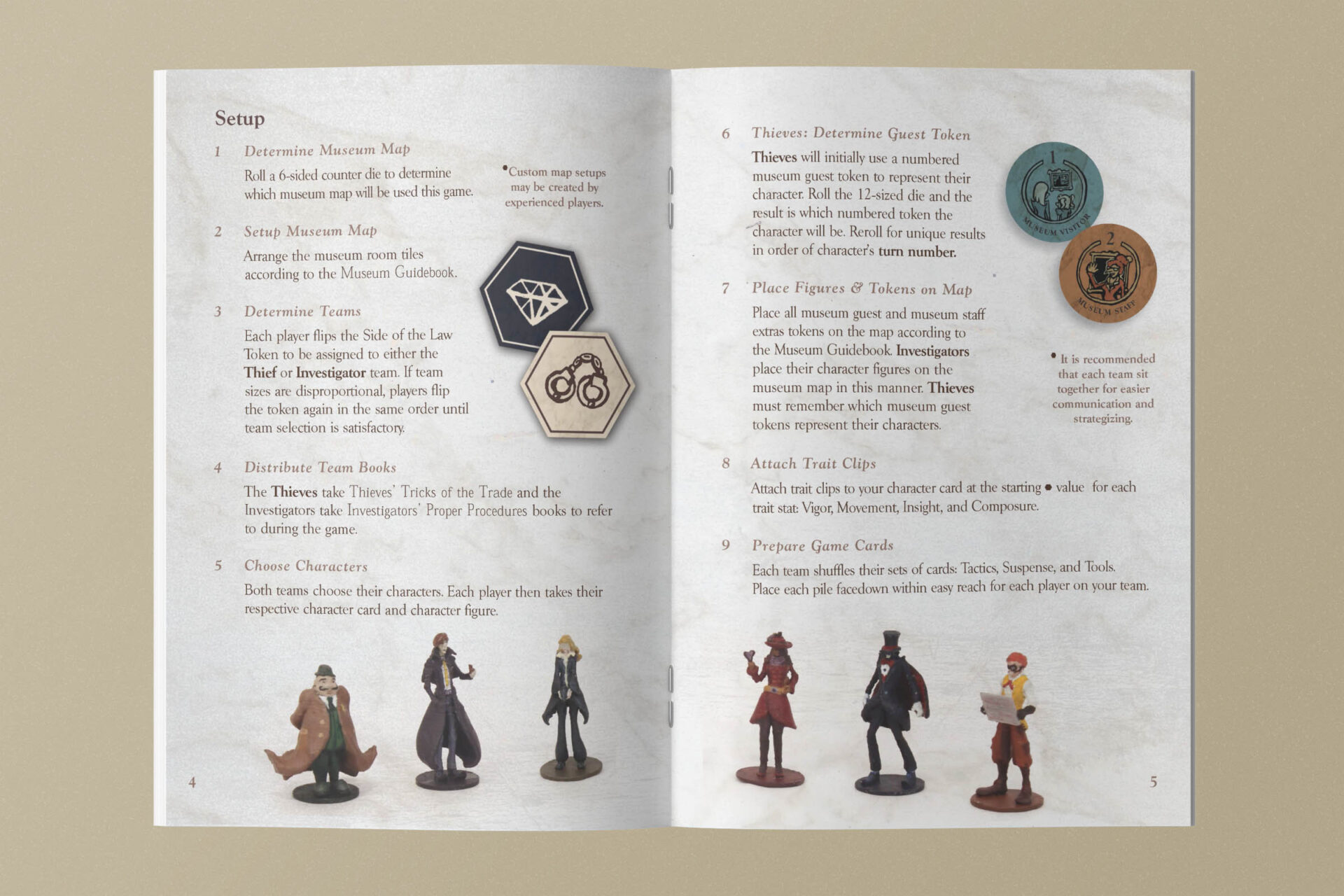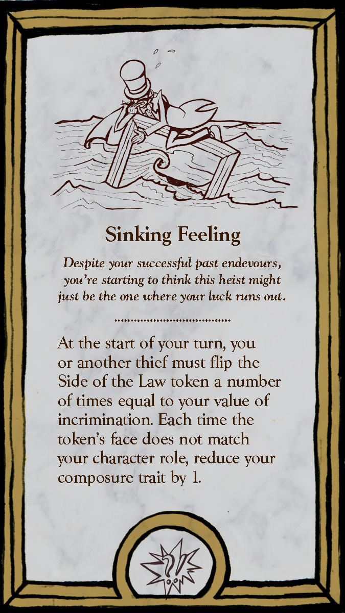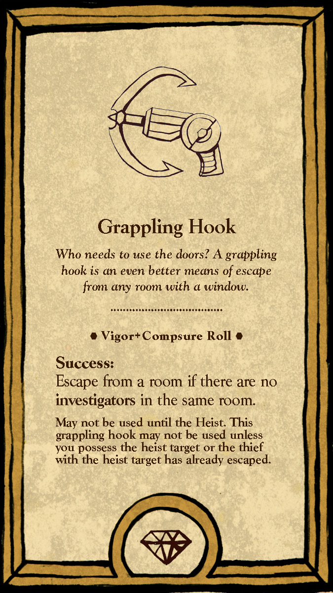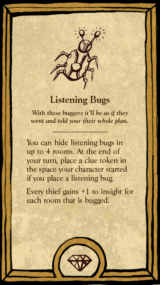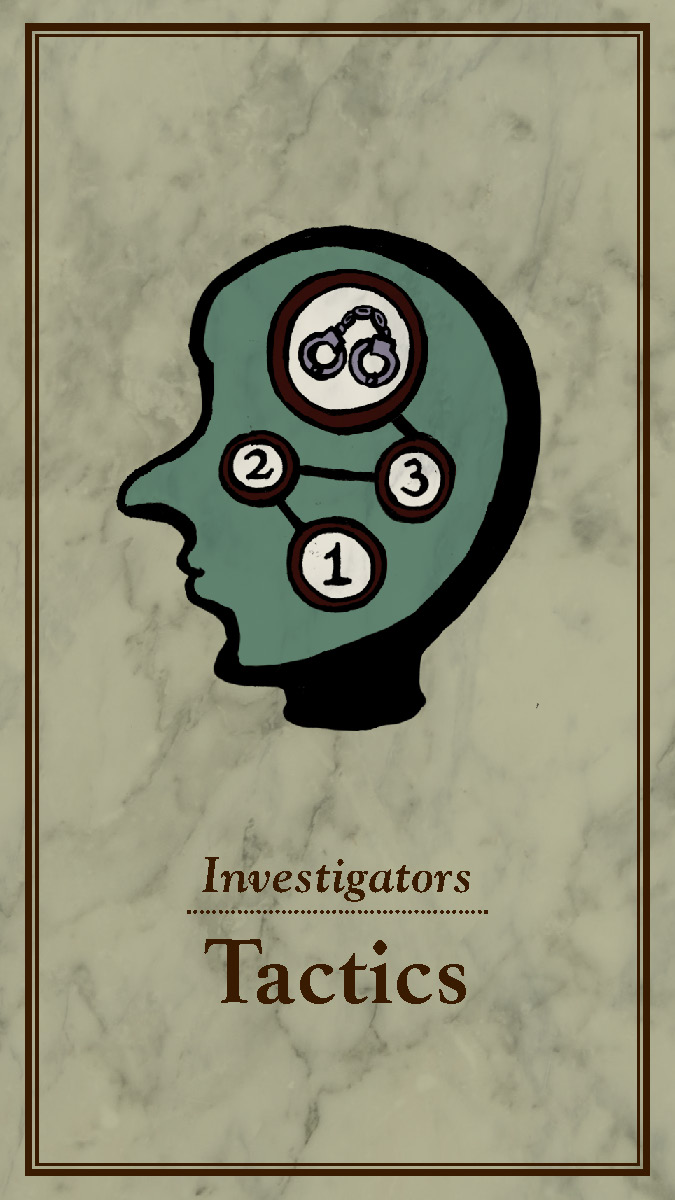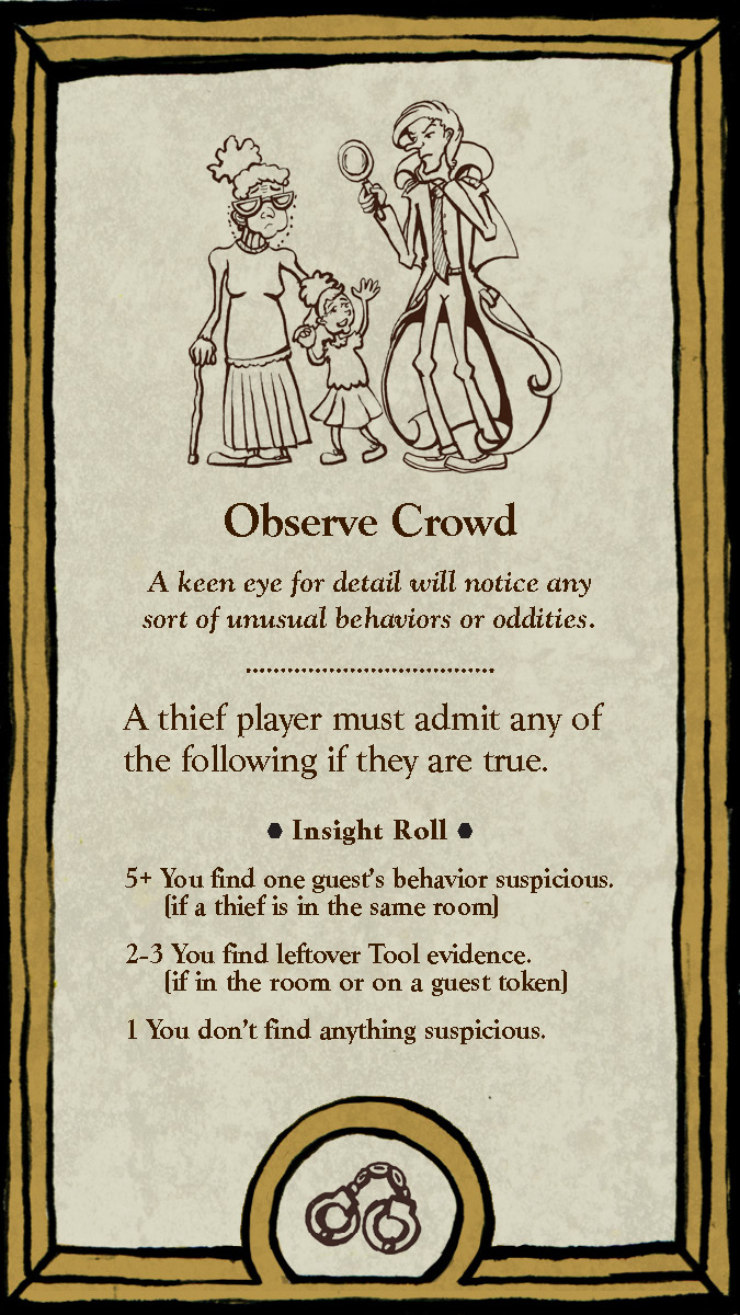 The six playable characters, three from the Thieves team and three from the Investigators team all have a unique primary color and starting trait points. The character cards help players keep track of increases and decreases to their stats, incrimination, or accusation as various tools, strategies, or suspense cards come into play.