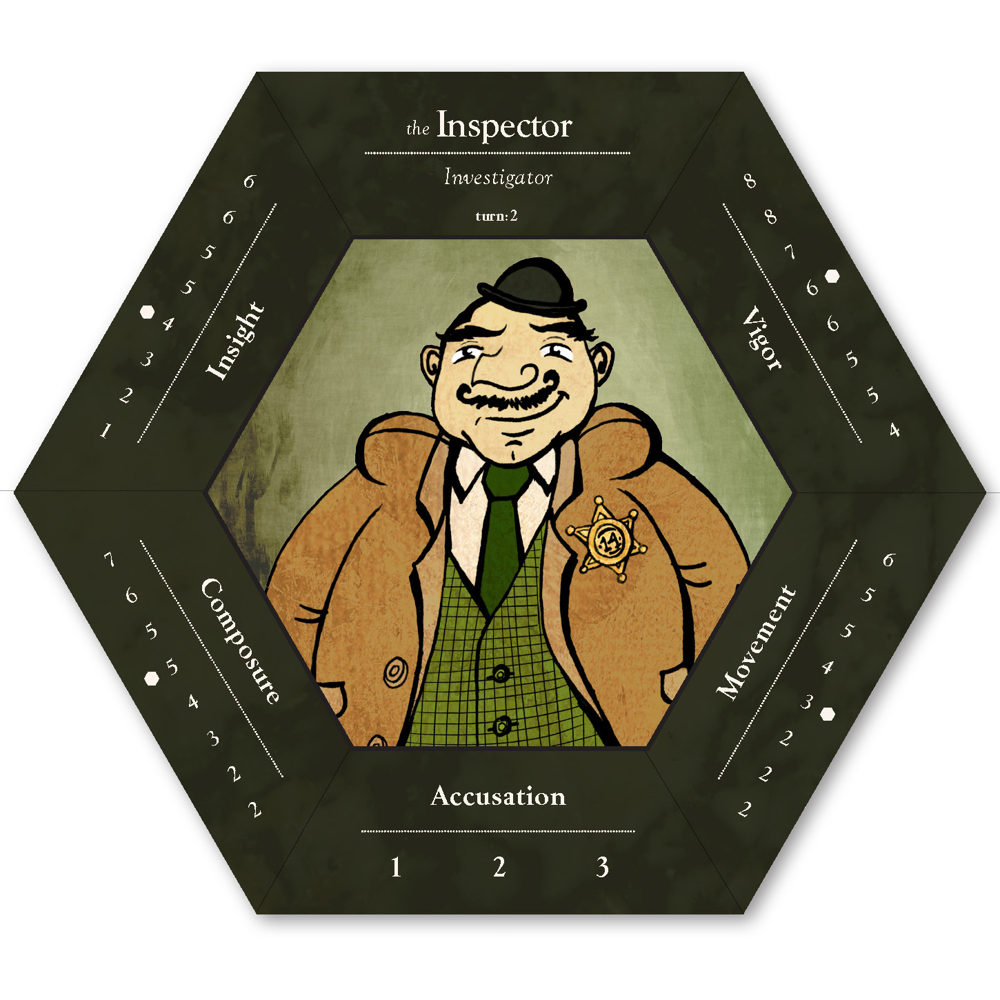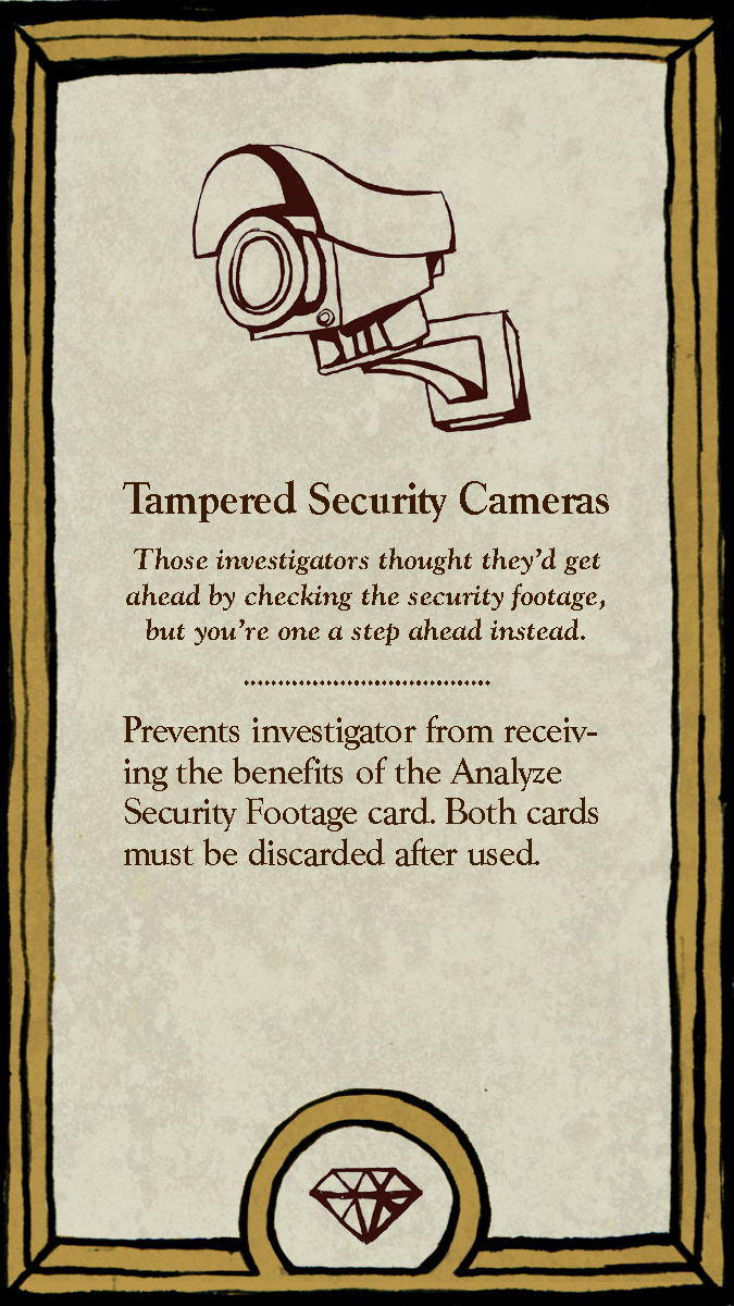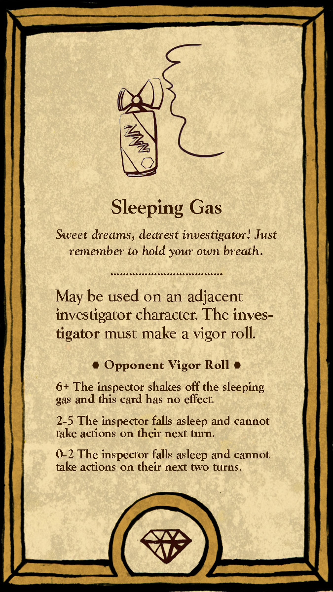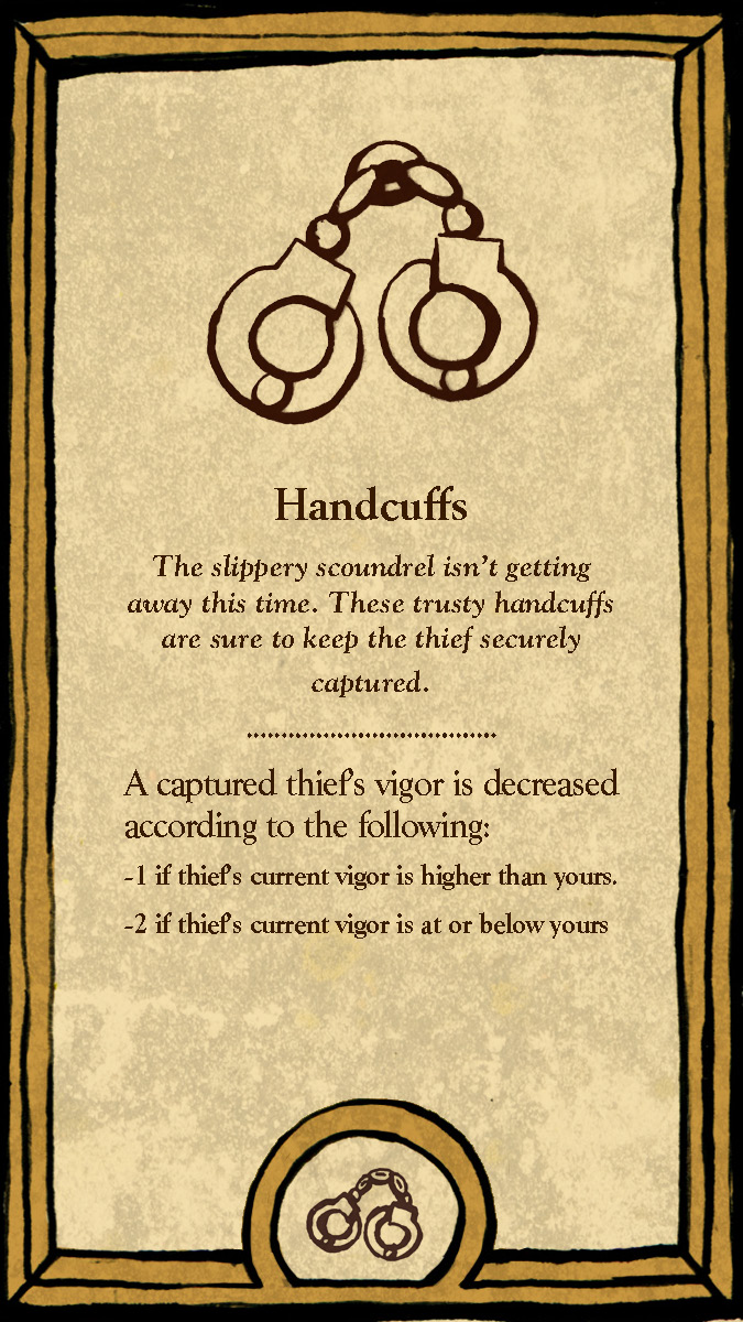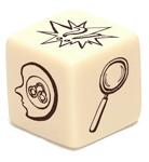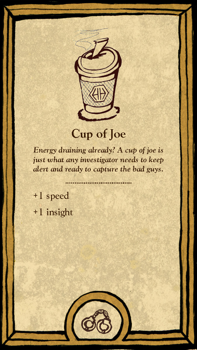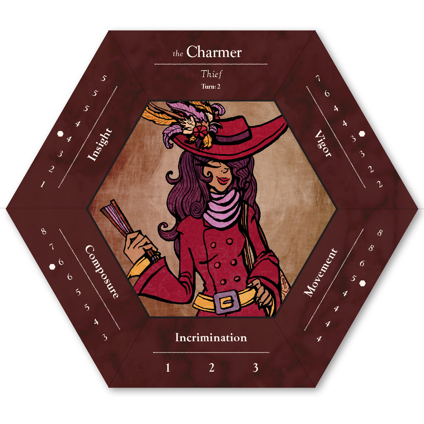 The six playable characters, three from the Thieves team and three from the Investigators team all have a unique primary color and starting trait points. The character cards help players keep track of increases and decreases to their stats, incrimination, or accusation as various tools, strategies, or suspense cards come into play.