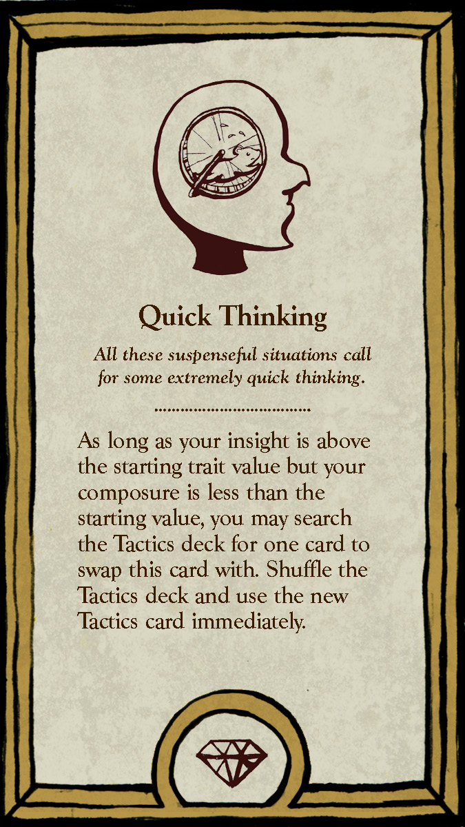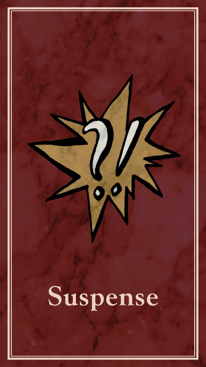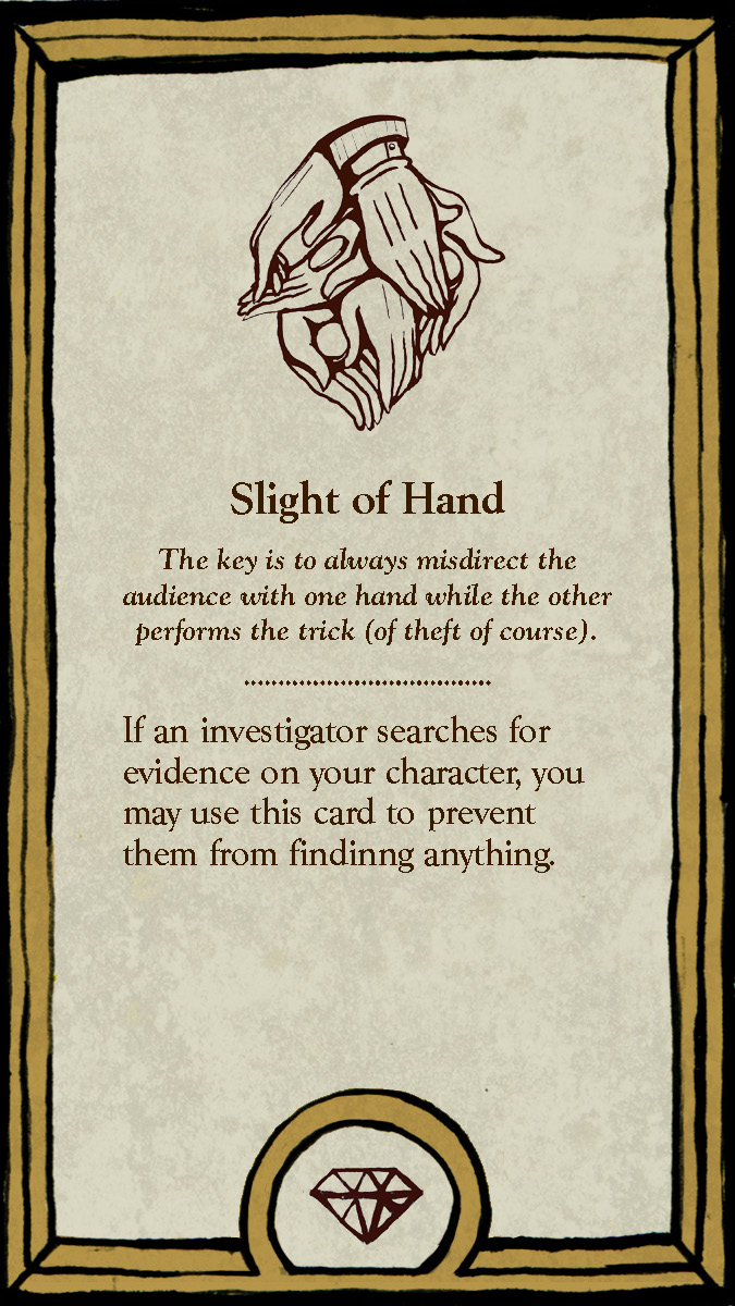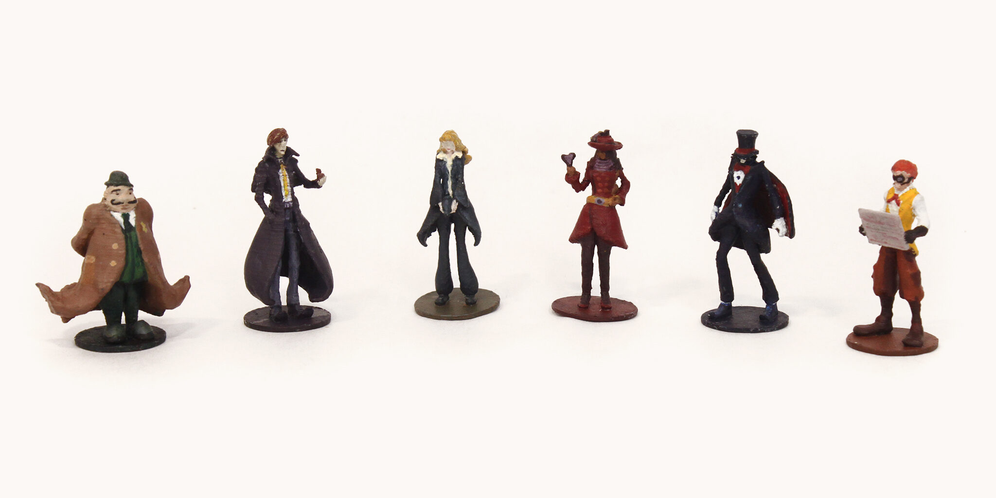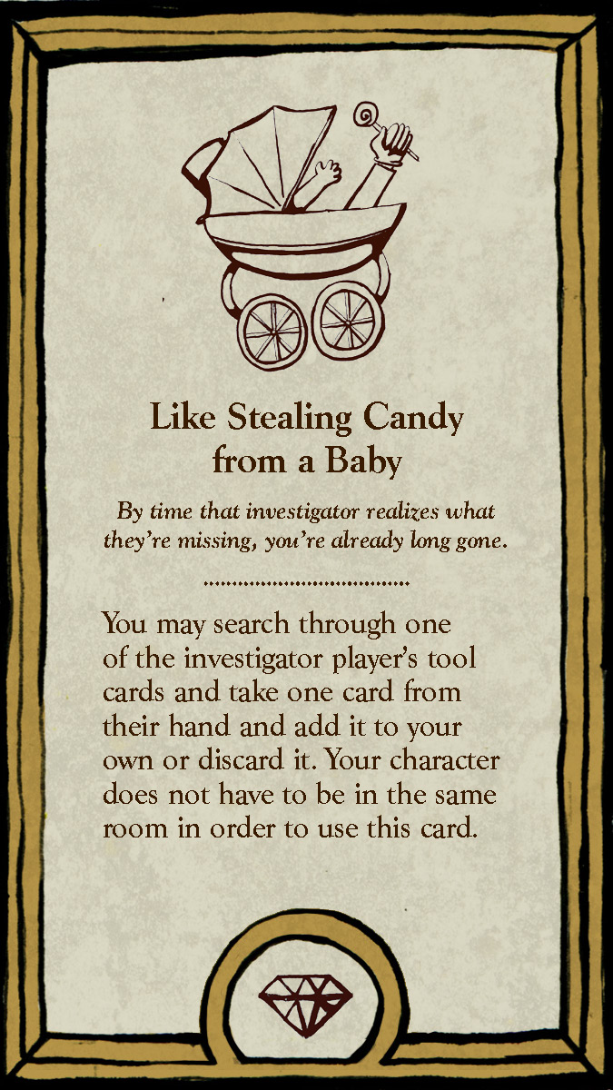 The six playable characters, three from the Thieves team and three from the Investigators team all have a unique primary color and starting trait points. The character cards help players keep track of increases and decreases to their stats, incrimination, or accusation as various tools, strategies, or suspense cards come into play.