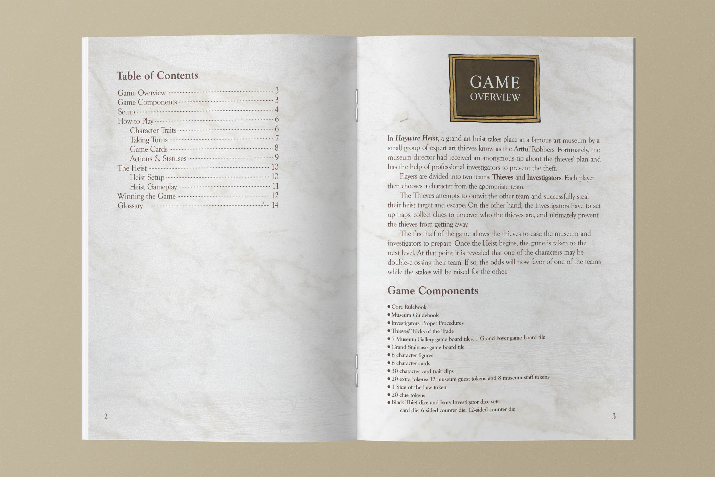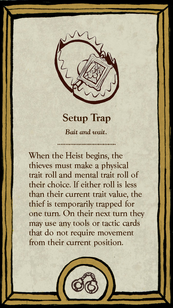 The premise of the game is that the players are split into two groups, the Thieves and the Investigators, and the gameplay occurs during a heist at one of six art museums. While the Thieves attempt to steal their target and escape, the Investigators have to set up traps, collect clues to uncover who and where the Thieves are, and ultimately prevent them from getting away.