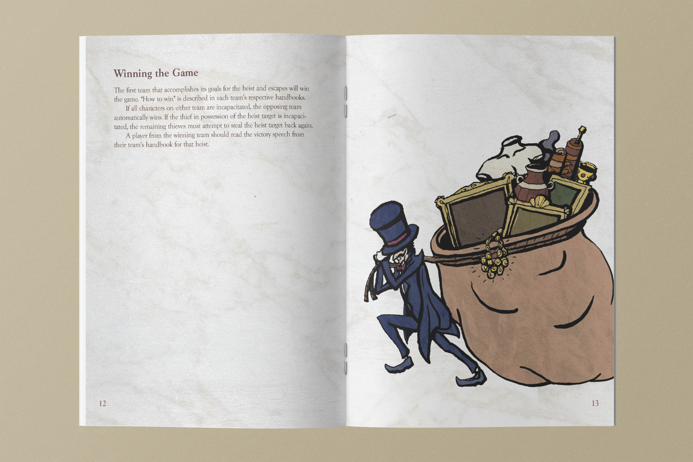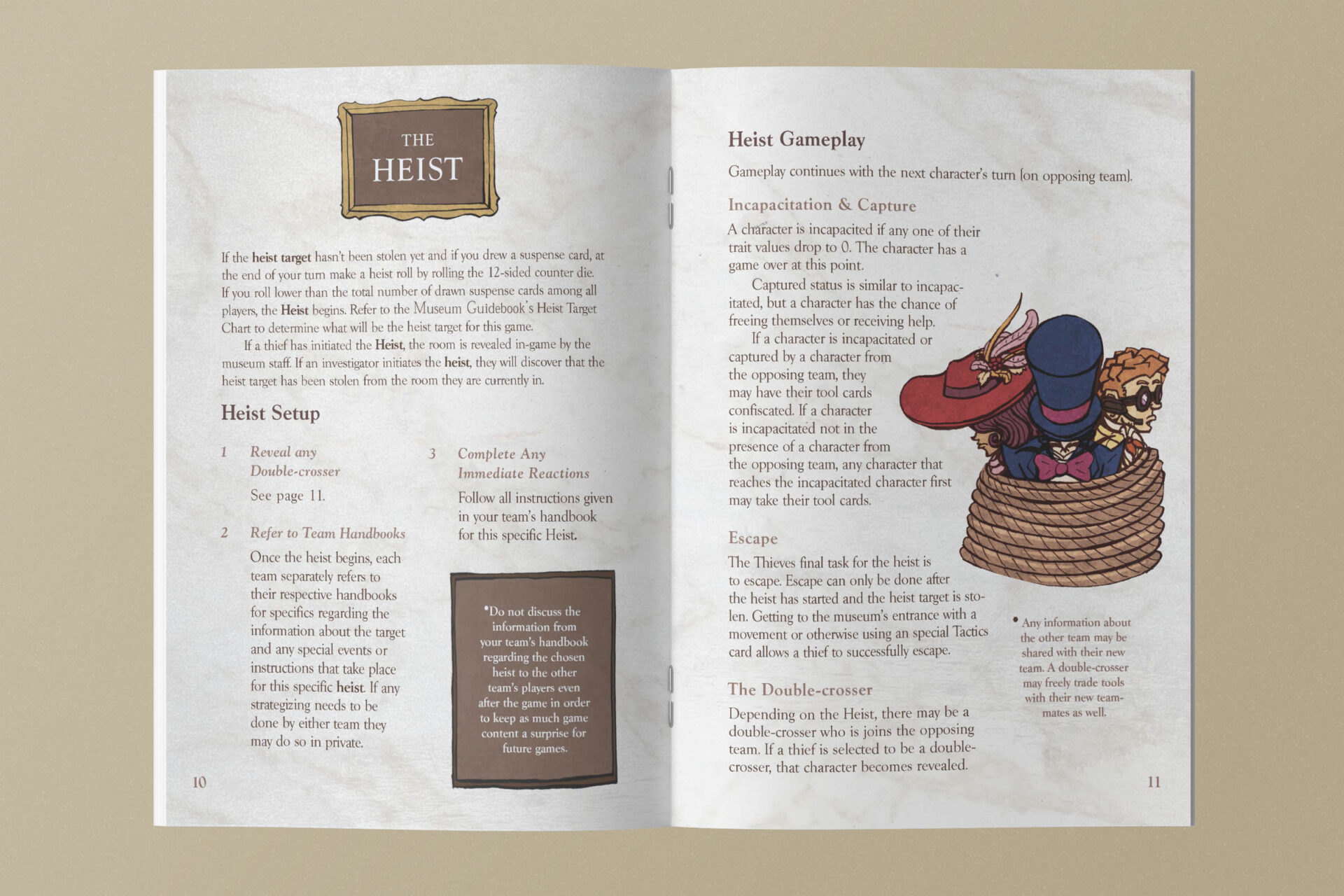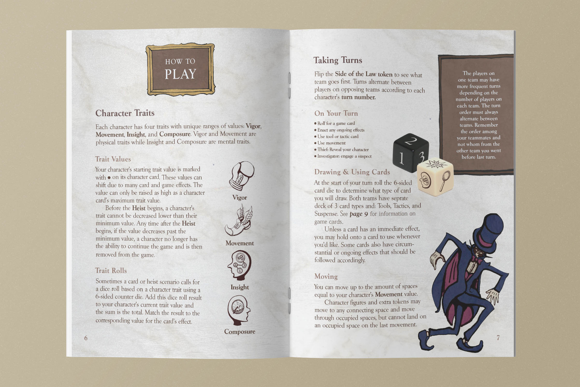 Due to the complexity of the game, a multi-page instruction booklet breaks down how to setup, play, and win the game. The rulebook features additional character illustration and illustrated callouts to help guide players to find important information.
